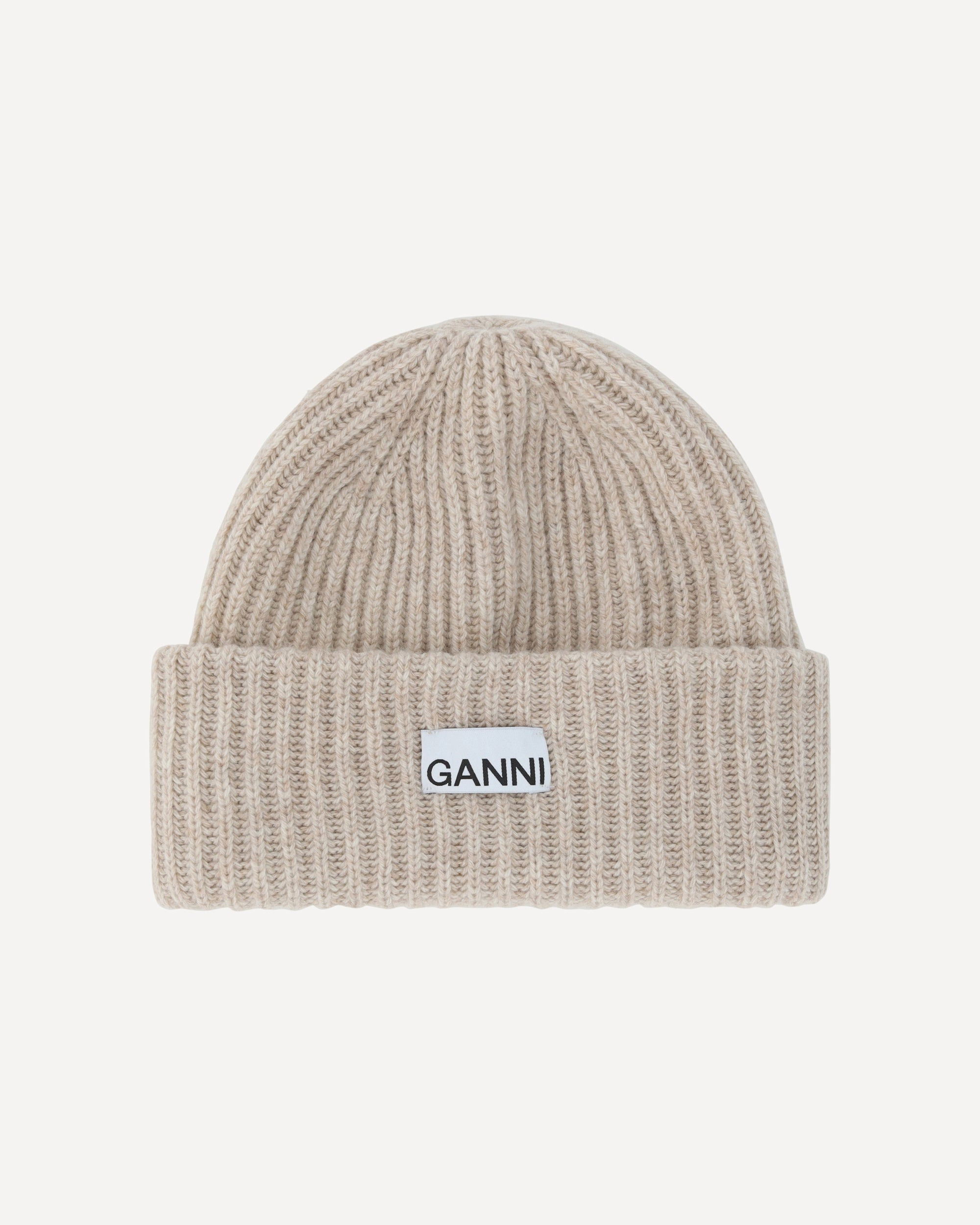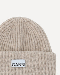 Wool Beanie Cap by Ganni, all-over ribbed design, turn-up hem, patch with iconic brand monogram embroidered on front. DETAILS - Sku: A4429_196 - Season: AW25 - Composition: GENERAL 80% Wool 20% Nylon - MADE IN MOLDOVA