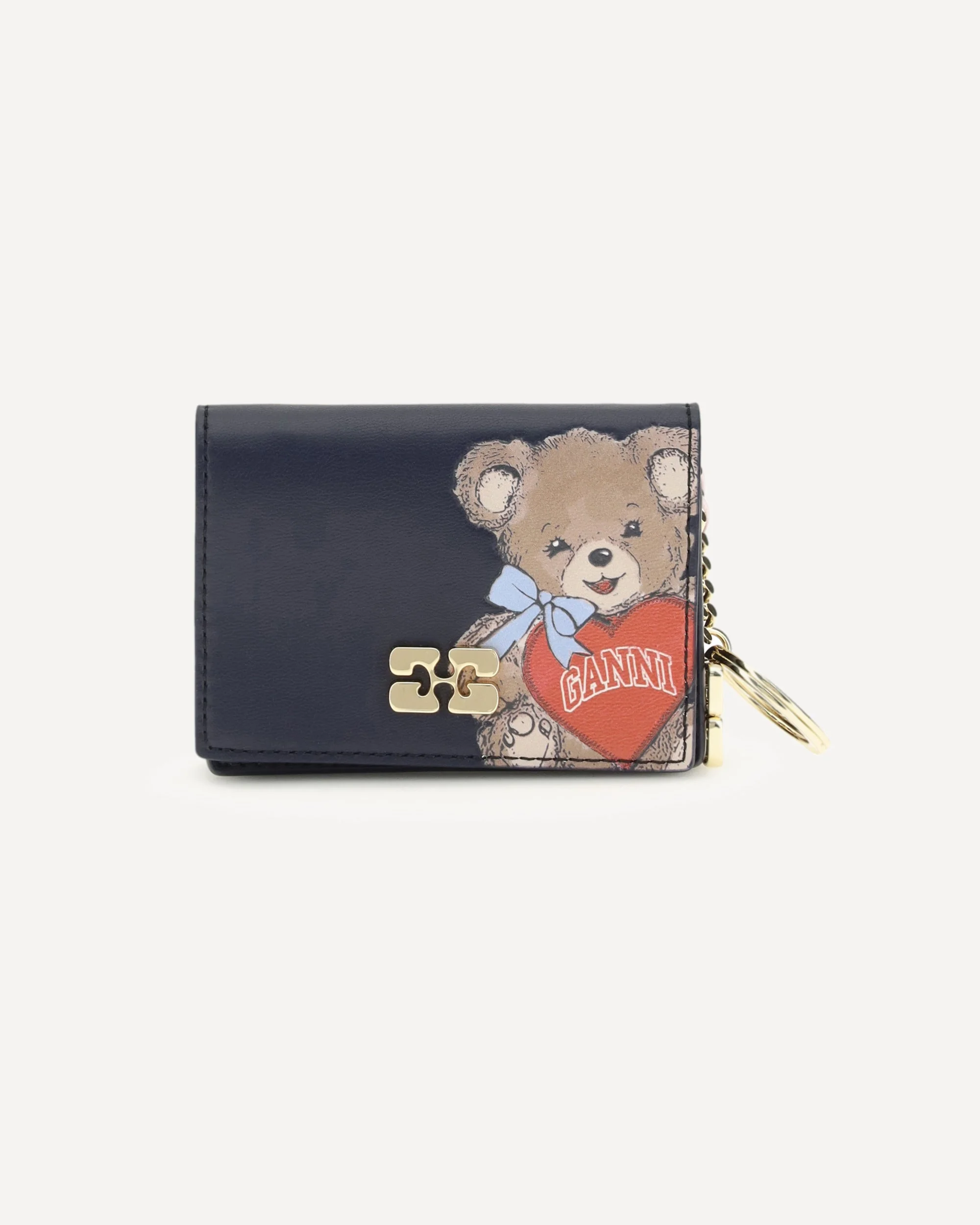 The Bear print Card Holder by Ganni is a practical and distinctive accessory, featuring a Poodle print with logo on the front. Equipped with an attached key ring, it has a coin slot and a card holder with button closure, combining functionality and playful style. DETAILS - Sku: B3010131_096 - Season: SS26 - Composition: GENERAL 65% Recycled Leather 19% Polyurethane 16% Polyester - MADE IN HONG KONG