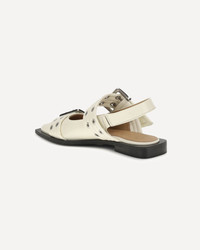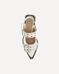 Calfskin Feminine Pumps by Ganni, elongated toe, double band at front adjustable by buckle, elastic slingback at heel, press-studded logo insole, slight block heel. DETAILS sku S2842_135 composition : CALF LEATHER BOS TAURUS 100% color group : WHITE gender : WOMAN season : AW24 size chart : SHOES IT category name : BALLERINAS