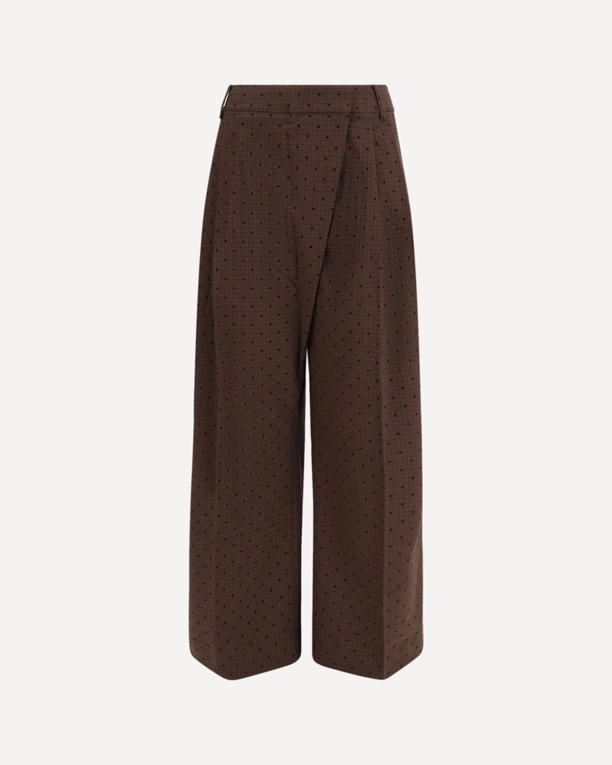 The flocked plaid crossover Pants by Ganni combine style and comfort in a sophisticated design. The flocked check print and crossover front detail create a distinctive effect, while the hook-and-eye closure and belt loops offer practicality. Side pockets and a Ganni logo patch on the back pocket add functionality and a touch of personality. Perfect for casual-chic looks, these pants are ideal for modern, versatile elegance. DETAILS - Sku: A1080035_979 - Season: SS26 - Fit: Regular - Composition: GENERAL 2% Elastane 64% Recycled Polyester 34% Viscose - MADE IN TURKEY
