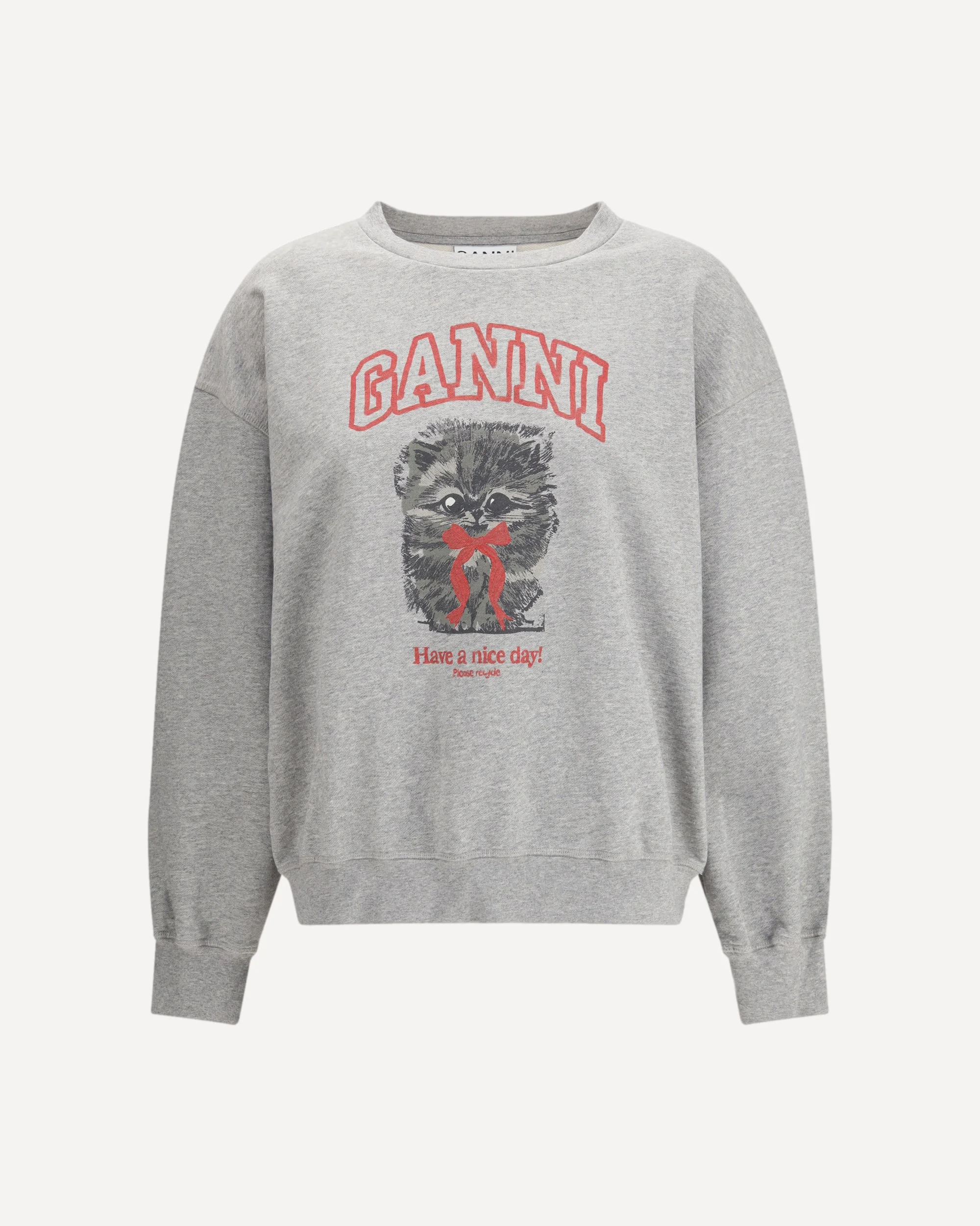 The Kitty Sweatshirt By Ganni elevates a classic sweatshirt into a playful and charming statement. The clean round neckline and long sleeves set a balanced silhouette, while the Kitty graphic adds a sweet, whimsical touch. The message “Have a nice day! Please recycle” brings a warm, conscious accent, perfectly aligned with Ganni’s spirited identity. Finished with the signature logo, it’s a piece that blends comfort and personality with effortless ease. DETAILS - Sku: A1060016G_920 - Season: SS26 - Fit: Oversize - Composition: GENERAL 100% Cotton - MADE IN PORTUGAL