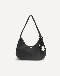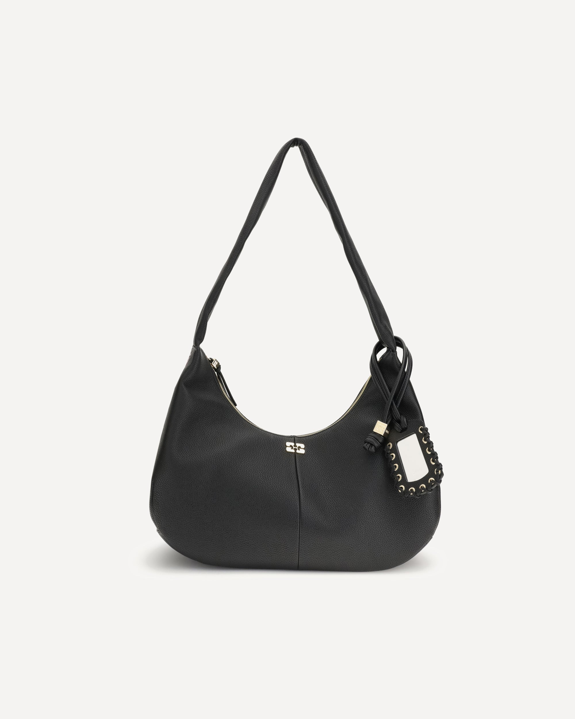 Ganni's Medium Leather hobo Shoulder Bag is a perfect blend of style and functionality. Made of grainy textured leather, it features a practical shoulder strap and a zipper closure for security. The gold-tone GANNI butterfly logo, engraved metal dice and embossed logo on the back add distinctive details. Inside, a main compartment and zippered pocket provide organized and practical space. DETAILS - Sku: A6981_099 - Season: AW25 - Dimension: 29x29x15 - Composition: GENERAL 52% Recycled Polyester 48% Polyurethane - MADE IN CHINA