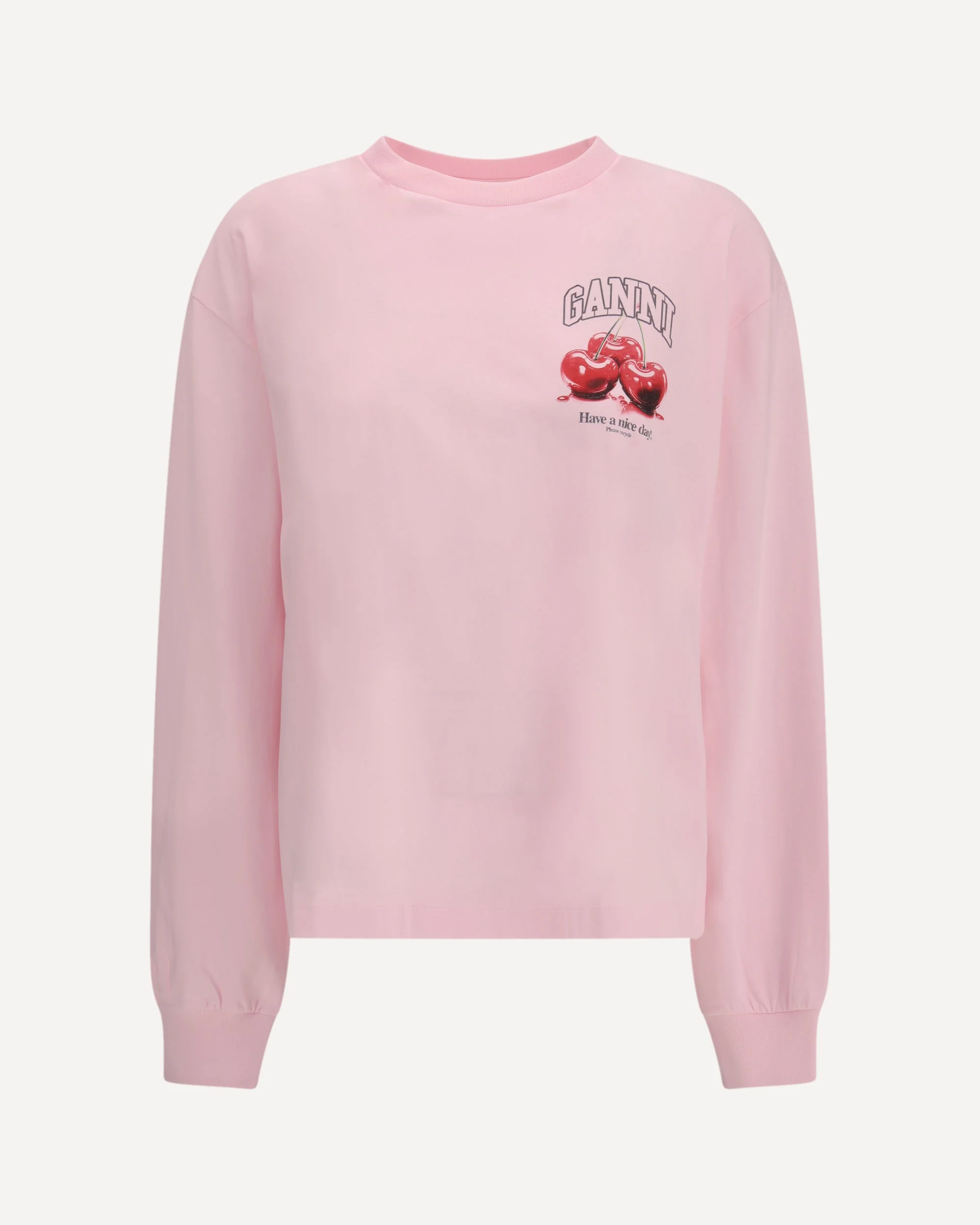The Long-Sleeve T-shirt By Ganni brings subtle charm to a clean, everyday silhouette. The round neckline creates a balanced, minimal frame, while ribbed cuffs add soft structure. On the upper left side, the small cherry graphic introduces a playful, signature touch that reflects Ganni’s joyful aesthetic. A piece that turns simplicity into quiet personality. DETAILS - Sku: A1050059_868 - Season: SS26 - Fit: Oversize - Composition: GENERAL 100% Cotton - MADE IN PORTUGAL