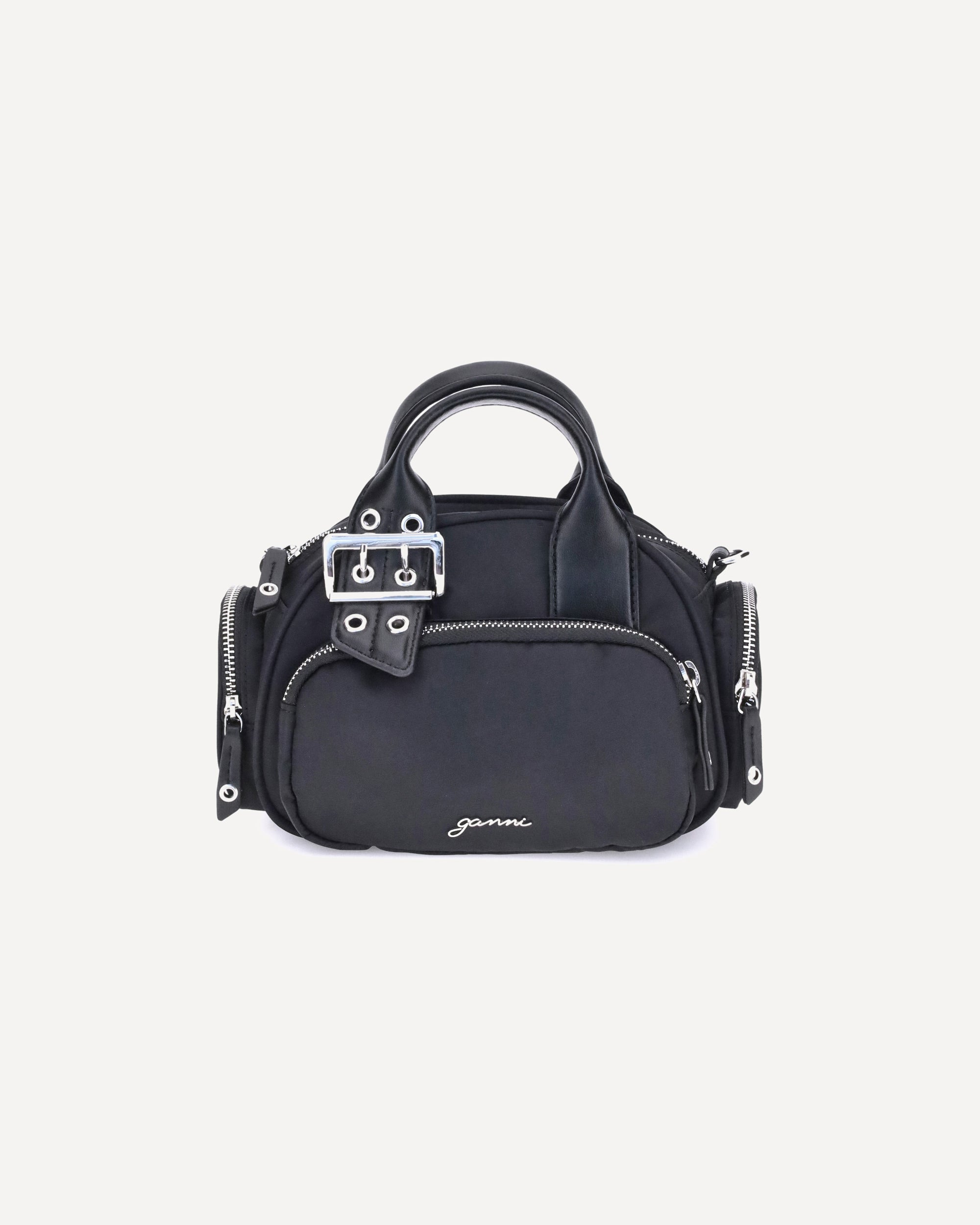 Ganni's Polochon mini Handbag combines functionality with contemporary style. Featuring a top handle and an adjustable shoulder strap with metallic trim, it has a secure zipper closure, a front pocket and two side pockets for convenient organization. The silver-tone GANNI logo completes the design with a distinctive touch. DETAILS - Sku: A6738_099 - Season: AW25 - Dimension: 19x19x8 - Composition: GENERAL 100% Nylon - MADE IN CHINA