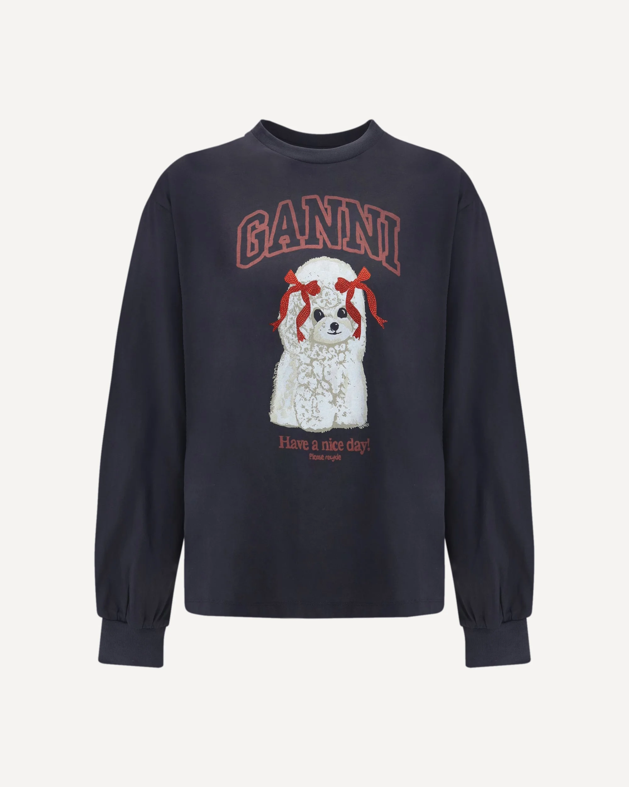 The Poodle Longsleeve By Ganni brings a charming, playful twist to an everyday essential. The round neckline and long sleeves create a clean, relaxed silhouette, while ribbed edges add subtle structure. The poodle print graphic infuses the piece with whimsical personality, complemented by the signature GANNI logo. A soft, expressive long-sleeve that blends comfort with unmistakable character. DETAILS - Sku: A1050036_252 - Season: SS26 - Fit: Oversize - Composition: GENERAL 100% Cotton - MADE IN PORTUGAL