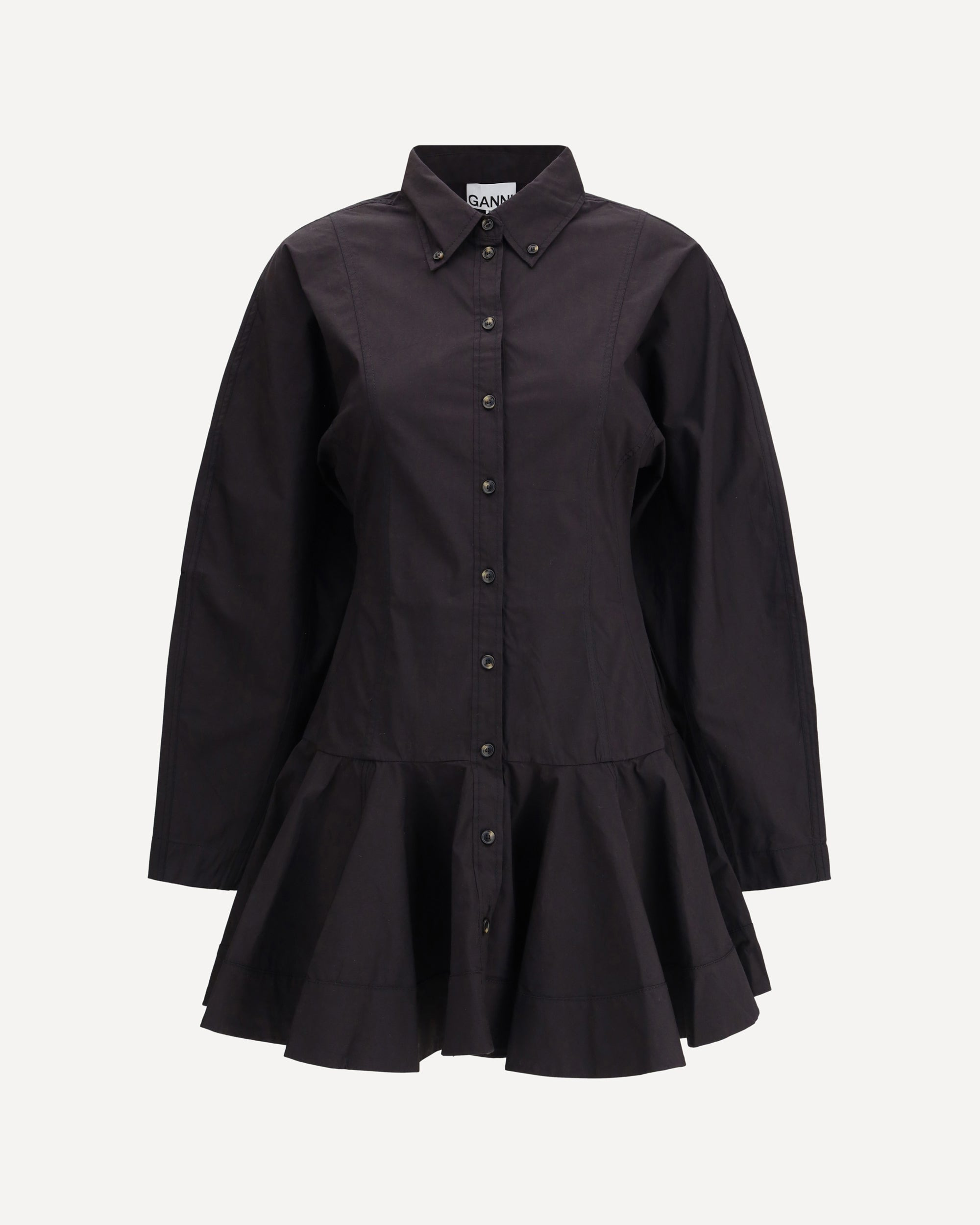 Ganni's Short chemisier Dress features a classic collar and a front button closure. It features long sleeves, a low waist and a gathered hemline, giving the garment a feminine and dynamic touch. DETAILS - Sku: W1001_099 - Season: AW25 - Fit: Regular - Composition: GENERAL 97% Cotton 3% Elastane - MADE IN INDIA