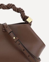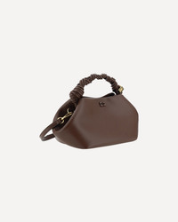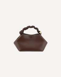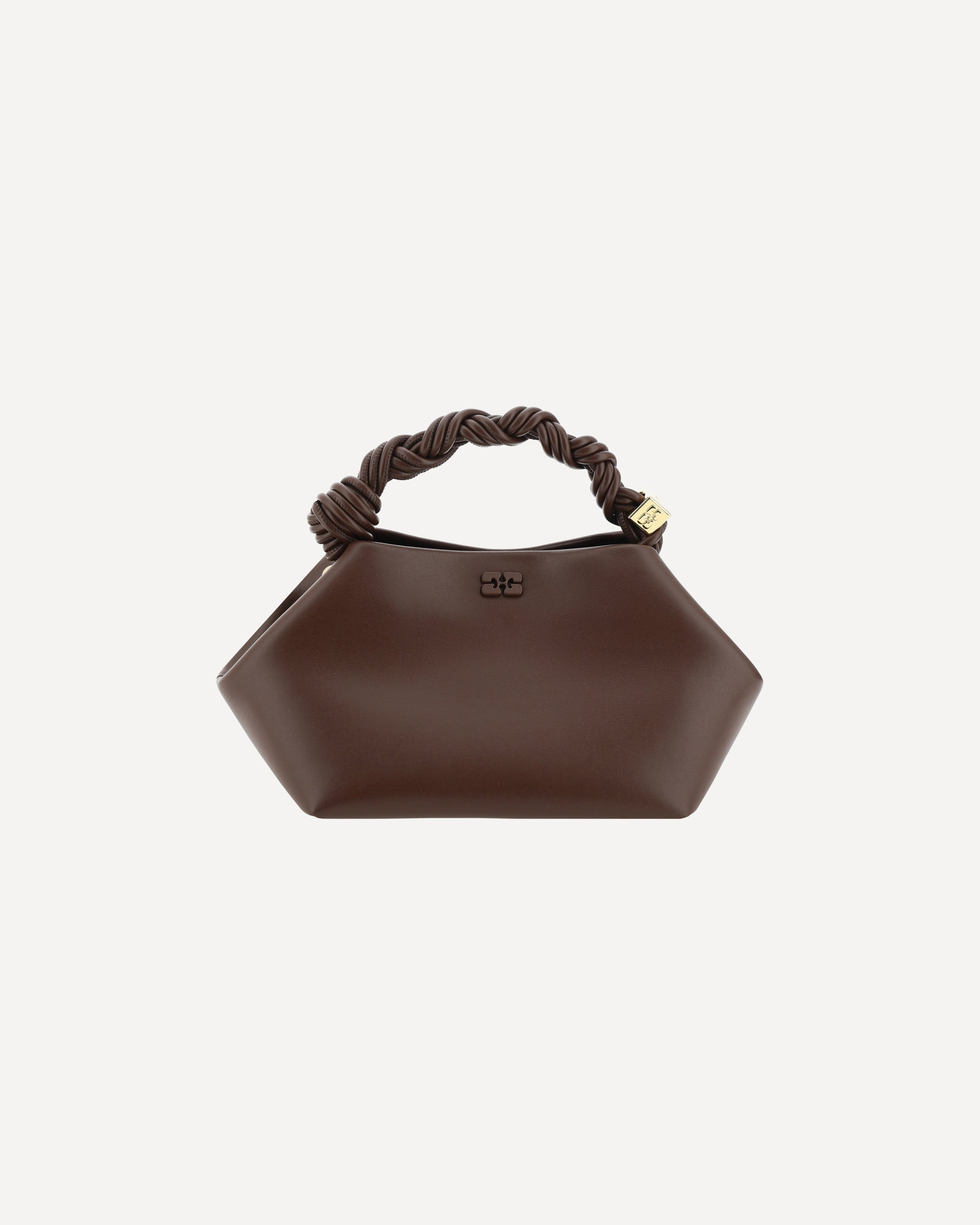 Certified Recycled Calfskin Mini Bou Handbag by Ganni, interior magnet closure, removable and adjustable flat shoulder strap, top handle with braided detail, hexagonal bag design, iconic three-dimensional Butterfly logo applique on front, interior welt pocket, dual interior compartments, metal brand logo dice engraved and applied to handle. DETAILS sku A5906_890 composition : CALF LEATHER BOS TAURUS 65% POLYETHYLENE 19% POLYESTER 16% color group : BROWN gender : WOMAN season : AW24 size chart : UNI category name : HANDBAGS dimensions : 14.5 x 31 x 17 cm