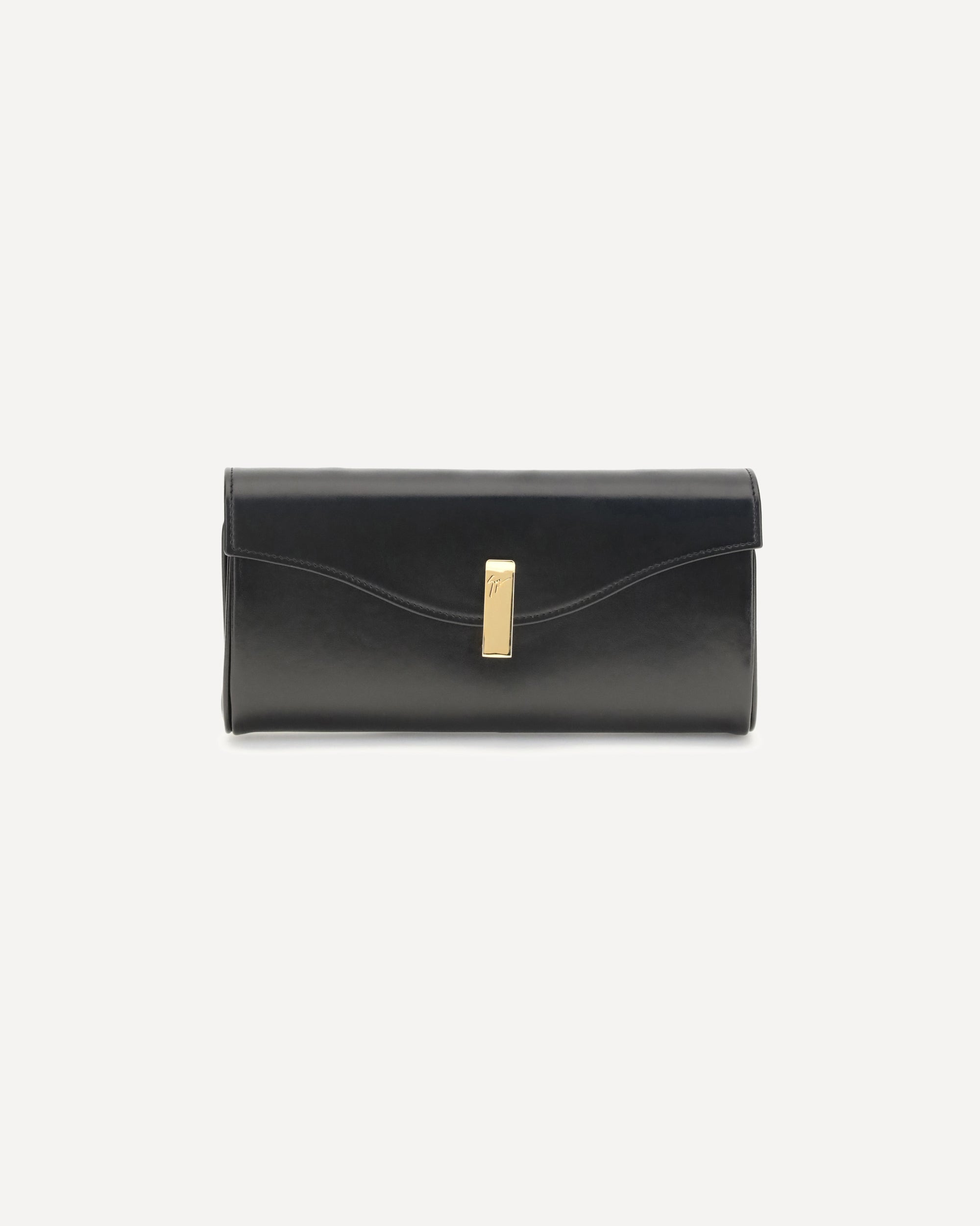 The Flutie Clutch Bag by Giuseppe Zanotti is a compact and refined accessory designed to complete any look with style. Made of smooth leather, it is distinguished by the logoed metal closure that adds an iconic and recognizable detail. The gold-tone chain shoulder strap lends a touch of luminous elegance, while the interior, equipped with a slip pocket and card slot, offers essential functionality. Ideal for evening occasions or for adding a chic accent to your everyday outfit. DETAILS - Sku: EB50002_006 - Season: AW25 - Dimension: 23x23x3 - Composition: GENERAL 100% Leather - MADE IN ITALY