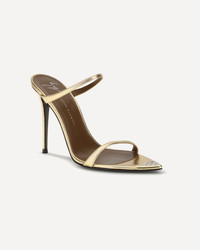 Giuseppe Zanotti's Intriigo Jewelry Sandals are a blend of boldness and contemporary elegance. An open-toe mule model crafted in laminated leather, they feature a toe decorated with a metal ferrule embellished with rhinestone-encrusted carre and baguette rhinestones, giving a luminous and sophisticated touch. The stiletto heel completes the design, giving momentum and femininity to every step. DETAILS - Sku: I500019_001 - Season: AW25 - Composition: GENERAL 100% Leather - MADE IN ITALY