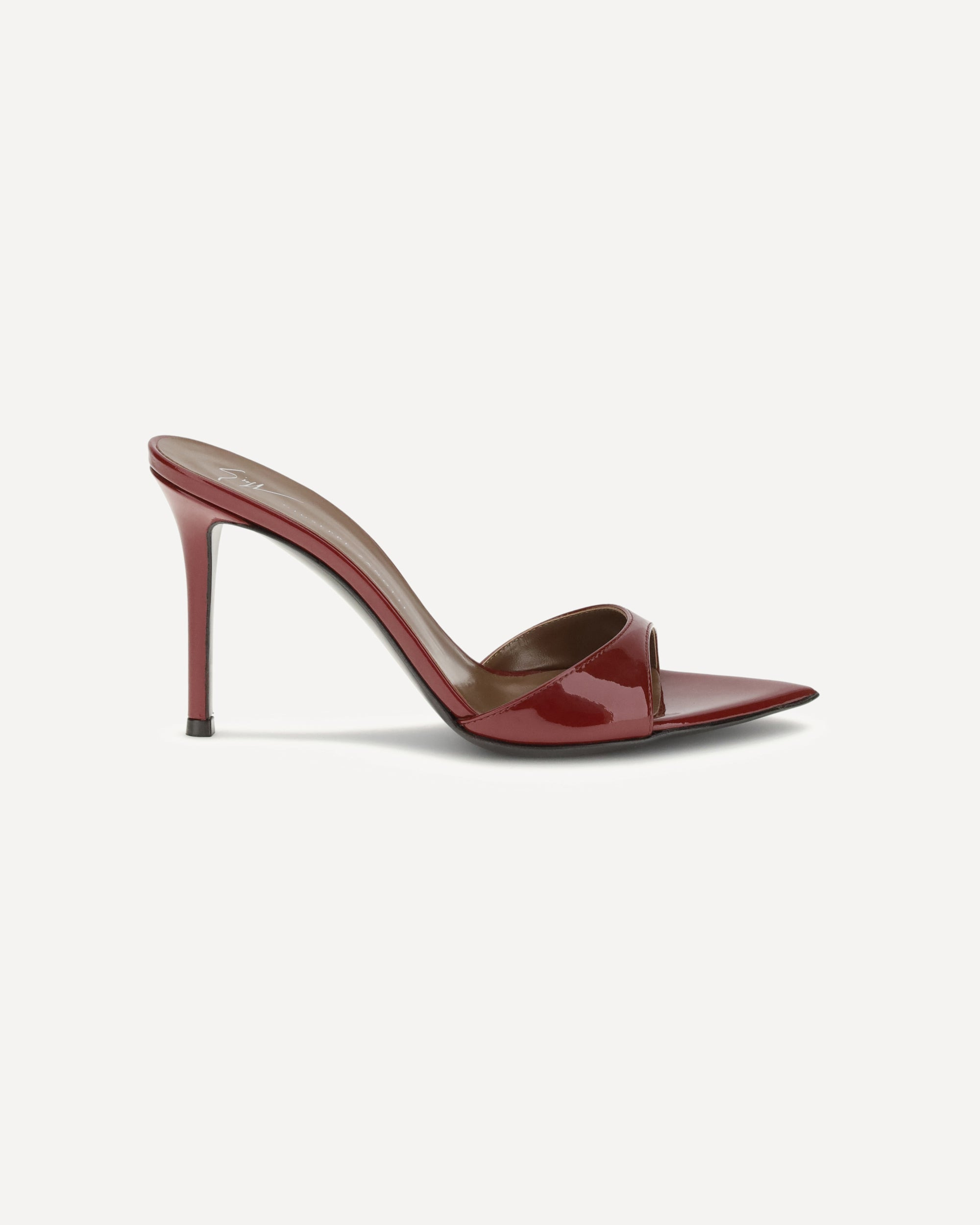 Giuseppe Zanotti's Intriigo Mule Sandals express elegance and sensuality in an essential form. Made of glossy patent leather, they feature a pointed open-toe design that slims the foot with sophistication. The stiletto heel completes the silhouette, adding a bold and feminine touch, perfect for special evenings or sophisticated looks. DETAILS - Sku: I400007_010 - Season: AW25 - Composition: GENERAL 100% Leather - MADE IN ITALY