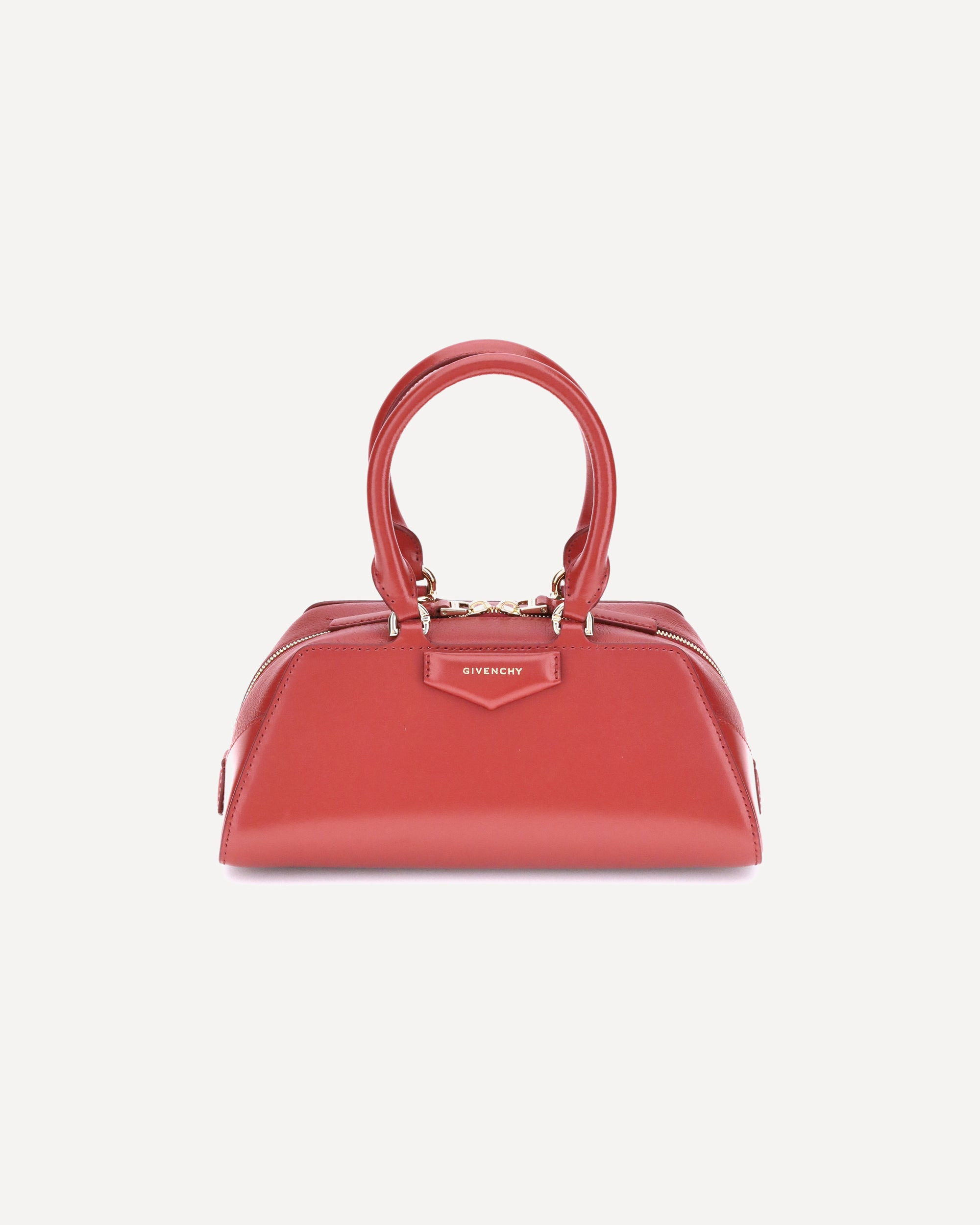 Givenchy's Antigona East West mini Handbag combines elegance and practicality in a compact size. Equipped with two articulated leather handles with four D-rings to attach the adjustable and removable shoulder strap, it is closed by a zipper that protects the single main compartment. A pentagonal signature embossed applique stands out on the front, while metallic details with a gold finish complete the design with refined brilliance. DETAILS - Sku: BB5146B2AQ_640 - Season: AW25 - Dimension: 24x24x11 - Composition: GENERAL 100% Calf Leather Bos Taurus - MADE IN ITALY