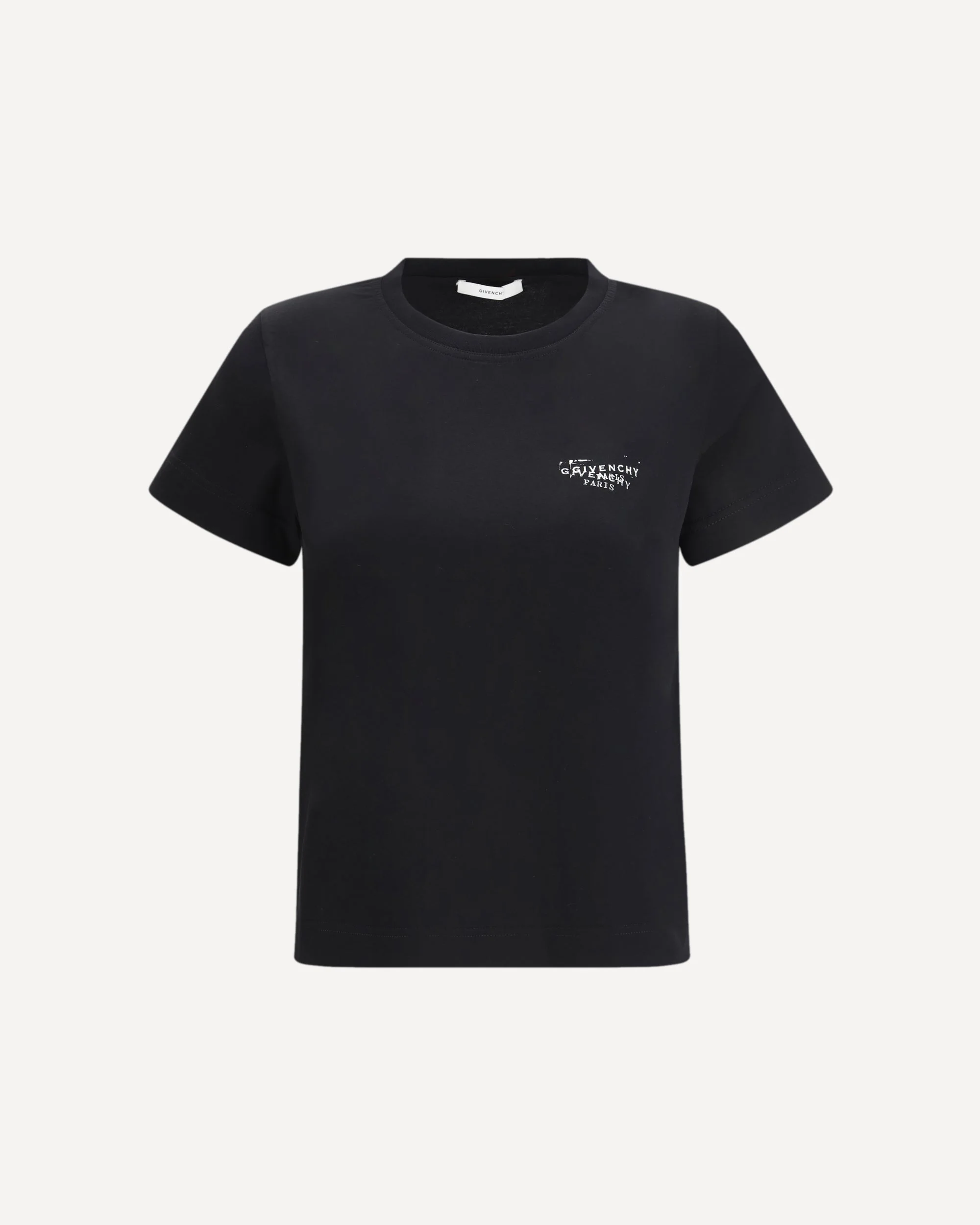 The cotton T-shirt by Givenchy is a versatile and refined garment featuring a ribbed crew neck that defines its structure. The contrasting logo, printed on both the front and back, lends a distinctive and modern touch. A minimal interpretation but with personality, perfect for adding a stylish accent to a casual look. DETAILS - Sku: BW70FJP7A7_001 - Season: SS26 - Fit: Regular - Composition: GENERAL 100% Cotton - MADE IN PORTUGAL