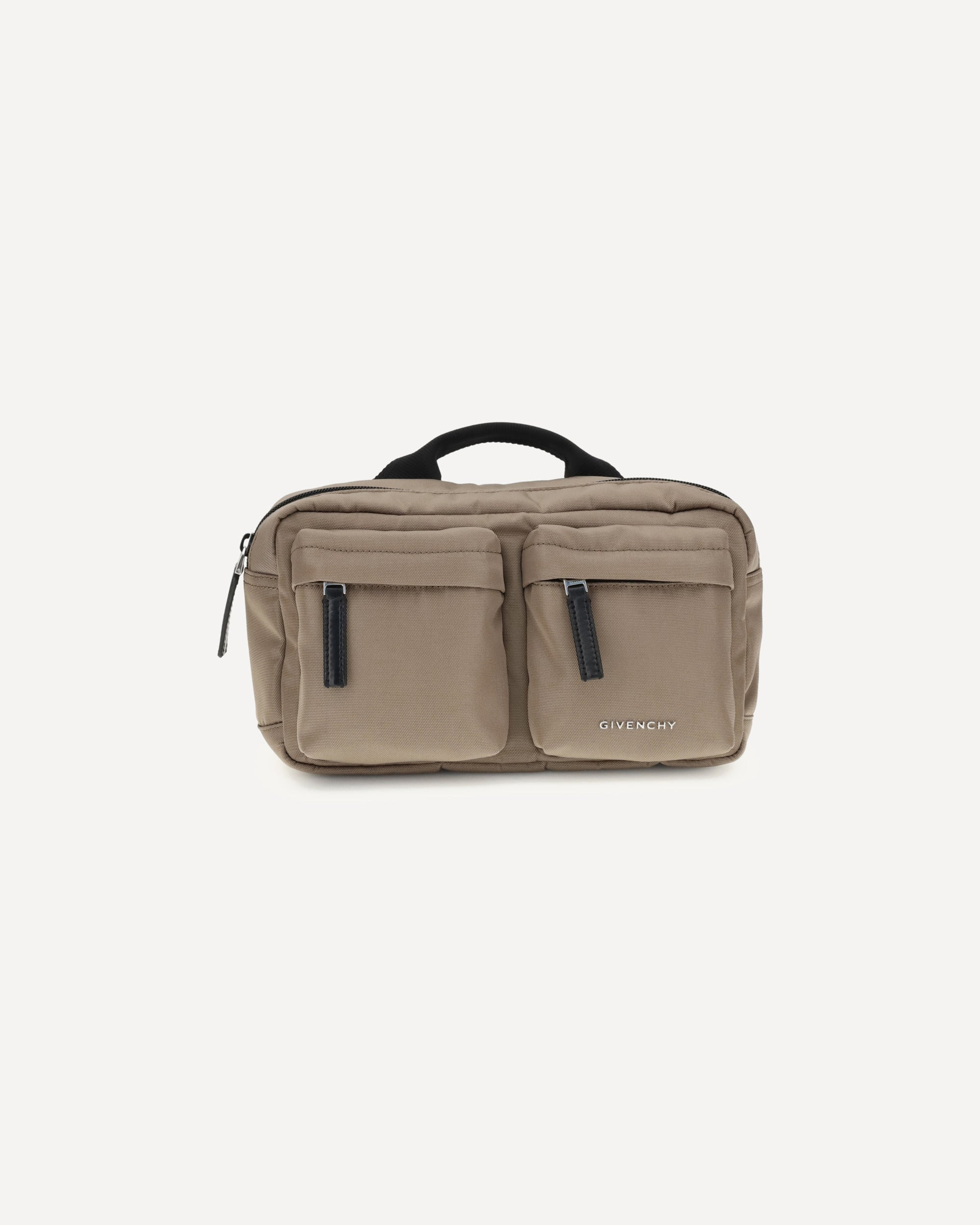 Givenchy's Essential U canvas Fanny Pack combines practicality and urban style. Made of durable canvas, it features a top handle, zipper closure and leather pull tab. The adjustable GIVENCHY webbing shoulder strap allows for crossbody wearability. Signature metal and silver details add a distinctive touch. A main compartment and two front zipper pockets complete the design. DETAILS - Sku: BK50F8K17S_280 - Season: AW25 - Dimension: 26x26x8 - Composition: GENERAL 100% Polyamide - MADE IN ITALY