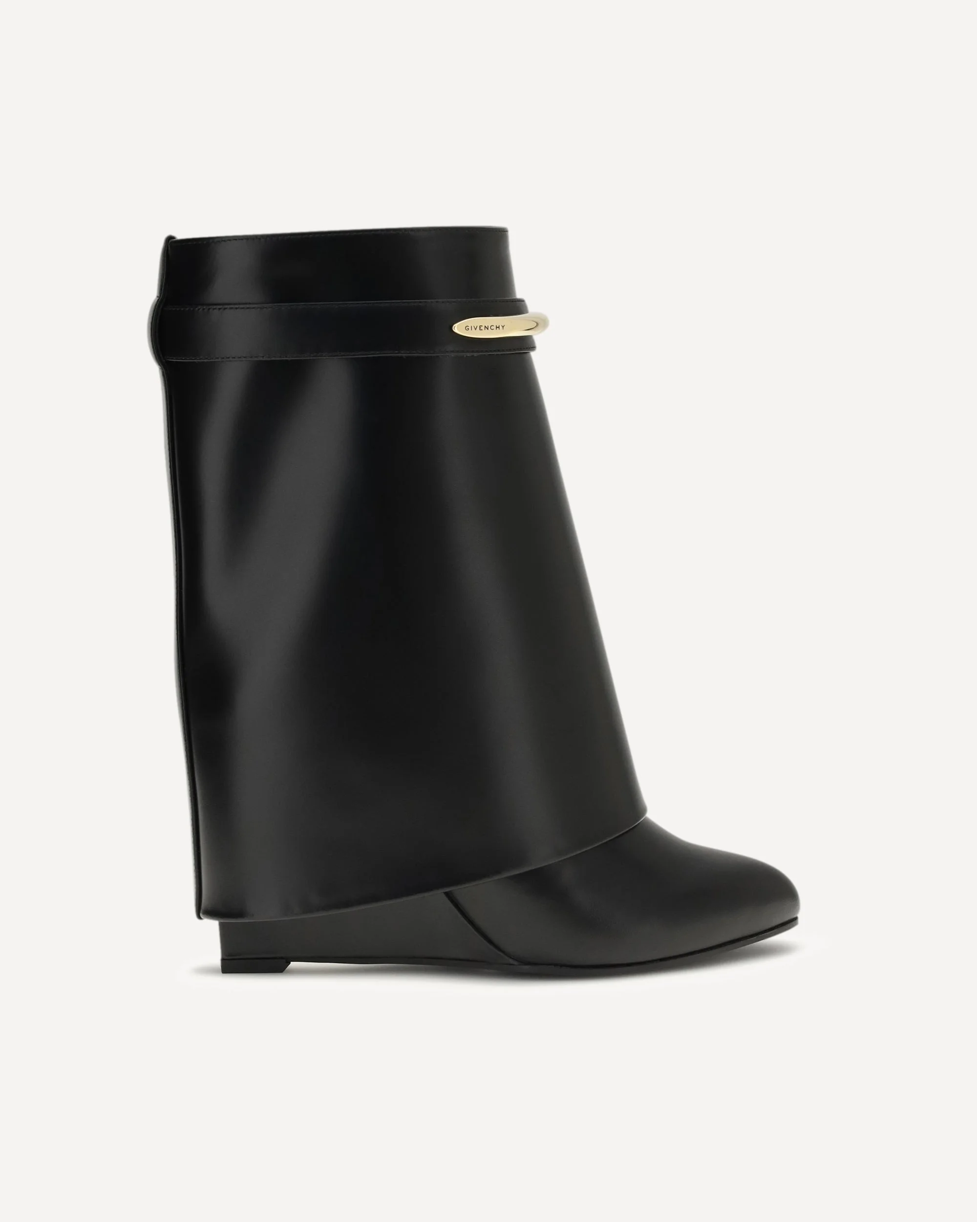 The leather Shark Ankle Boots by Givenchy are a bold mix of elegance and grit. With a distinctive Shark silhouette, they feature a metal clip engraved with "GIVENCHY" and gold-finish metal details that enhance the design. The pointed toe and covered wedge heel add a sophisticated touch, while the wraparound upper provides optimal support for the foot, ensuring comfort and stability. Perfect for those looking for a bold, contemporary style. DETAILS - Sku: BE605LE1J7_001 - Season: SS26 - Composition: GENERAL 100% Calf Leather Bos Taurus - MADE IN ITALY