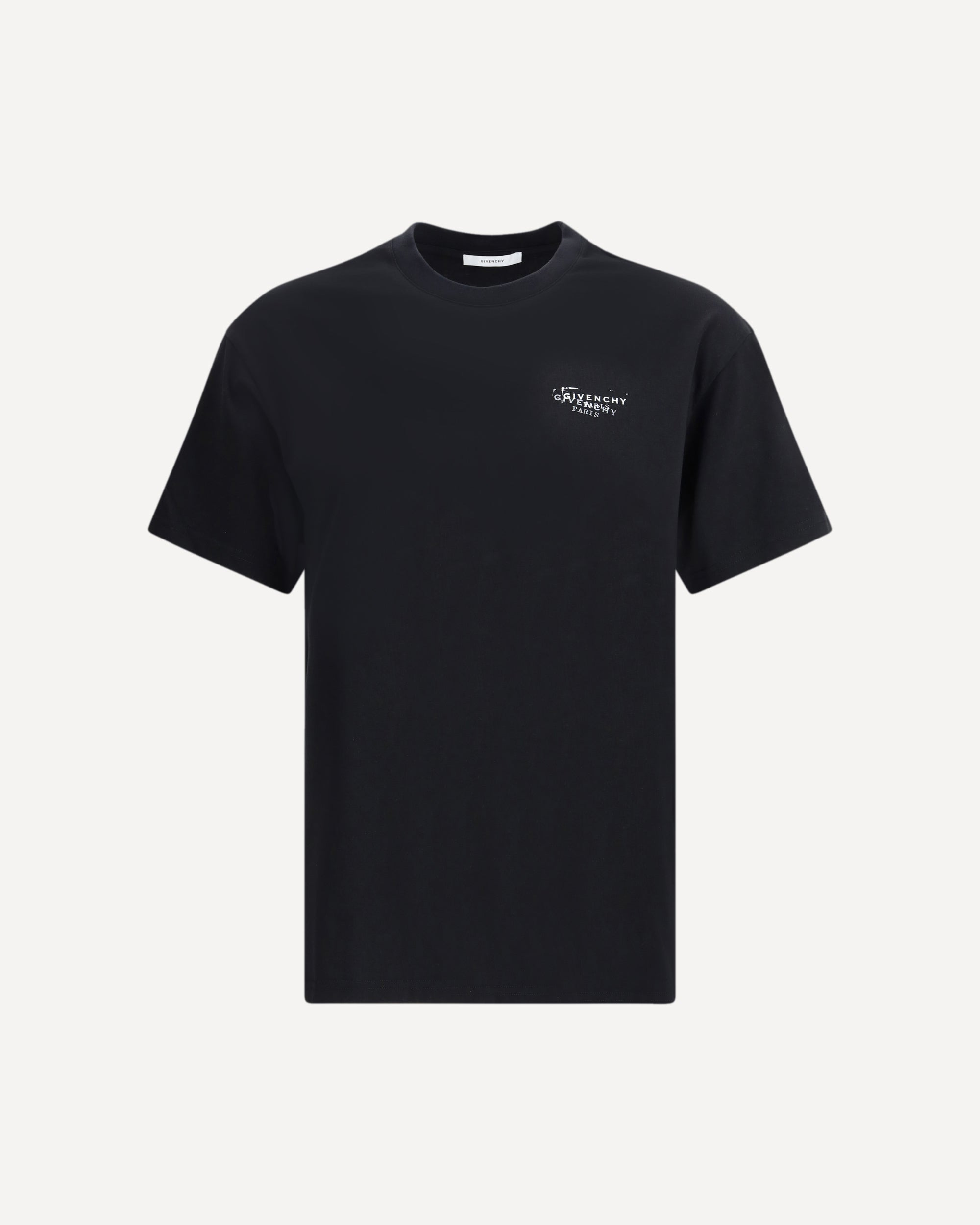 The logo cotton T-shirt by Givenchy is a wardrobe classic, featuring a clean, comfortable crew neck. The small GIVENCHY Stamp print on the chest and the GIVENCHY Stamp print on the back add a distinctive, bold touch, making this T-shirt a versatile and iconic piece for those seeking a minimalist style with a strong visual impact. Perfect for pairing with casual or more sophisticated looks. DETAILS - Sku: BM71NK3YSA_001 - Season: SS26 - Fit: Regular - Composition: GENERAL 100% Cotton - MADE IN PORTUGAL