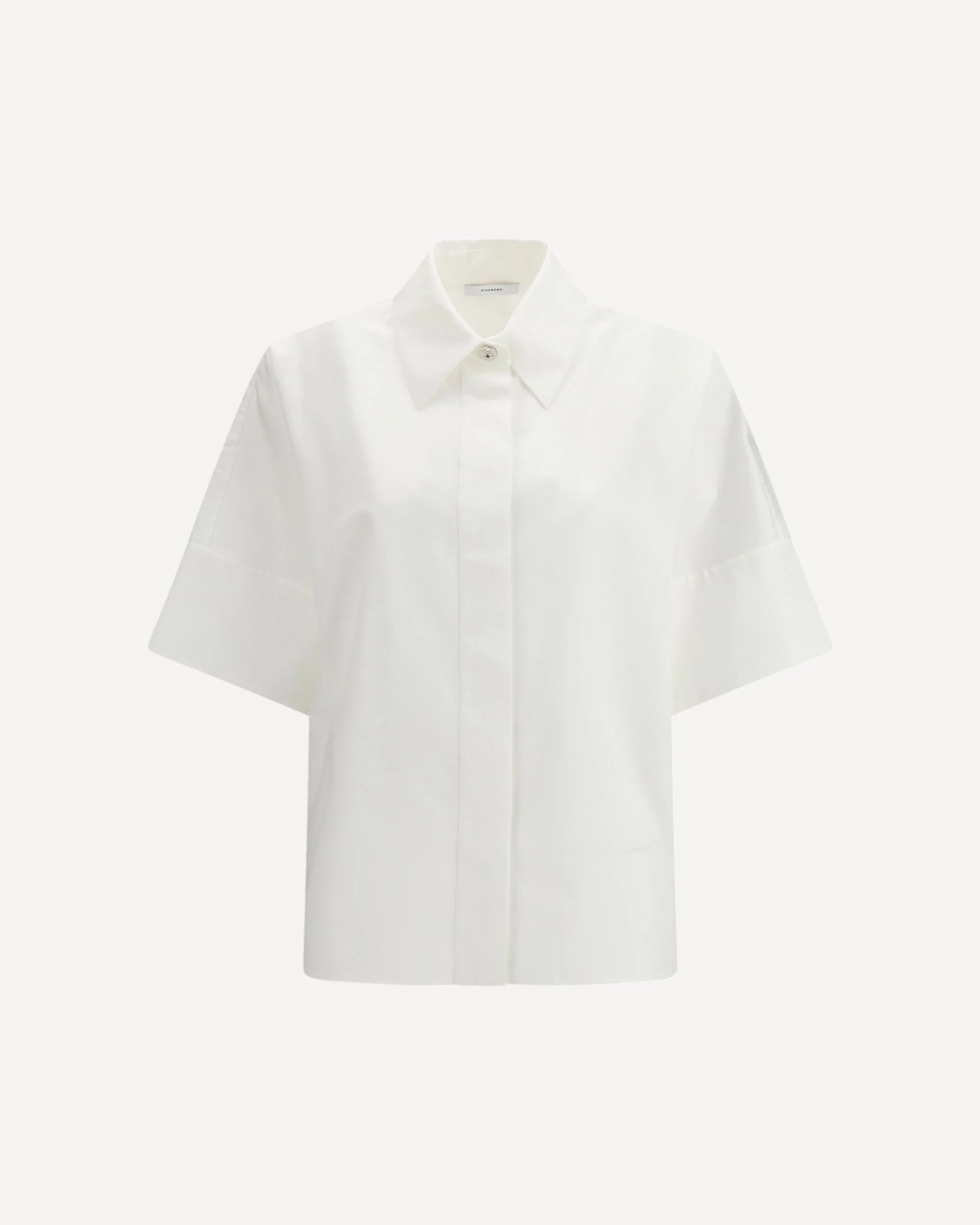 The poplin Shirt by Givenchy expresses a modern tailoring sensibility through the crisp cotton structure and short-sleeve design. The classic collar and concealed button closure create a clean aesthetic, while the engraved Givenchy button adds a refined signature detail. The cape detail at the back brings movement and dimension, redefining the piece with unexpected elegance. DETAILS - Sku: BW61J41634_100 - Season: SS26 - Fit: Regular - Composition: GENERAL 100% Cotton - MADE IN ITALY