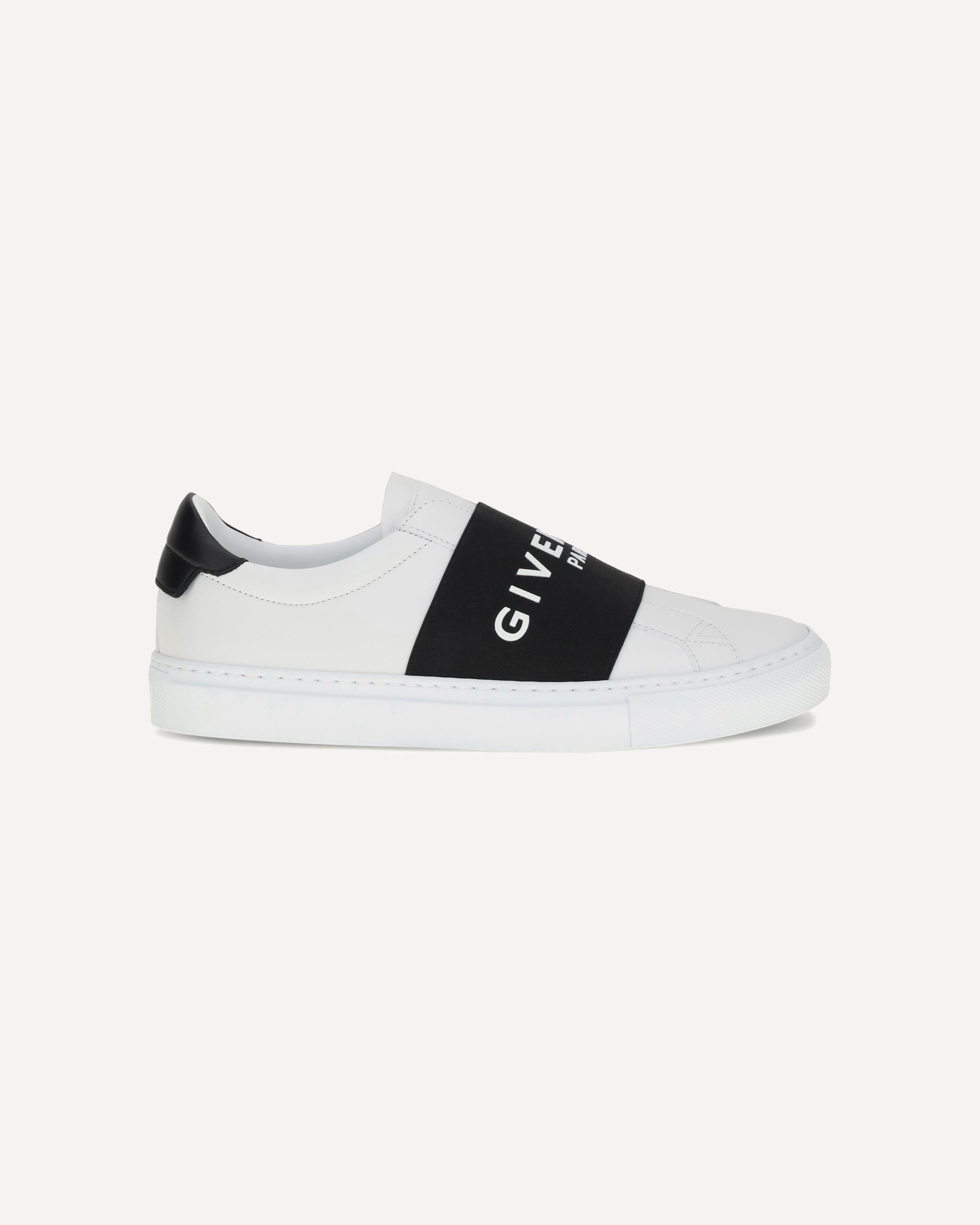 Givenchy's Urban Street Sneakers are slip-ons made of smooth calfskin leather, featuring an embossed logo on the back and enhanced by a contrasting elastic band with Givenchy Paris lettering on the instep. Equipped with a padded ankle for maximum comfort, they feature a contrasting leather heel and printed logo on the inside, combining modern design and functionality. DETAILS - Sku: BE004JE2DC_116 - Season: AW25 - Composition: UPPER 100% Calf Leather Bos Taurus SOLE 100% Rubber - MADE IN PORTUGAL