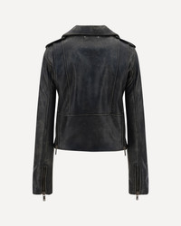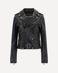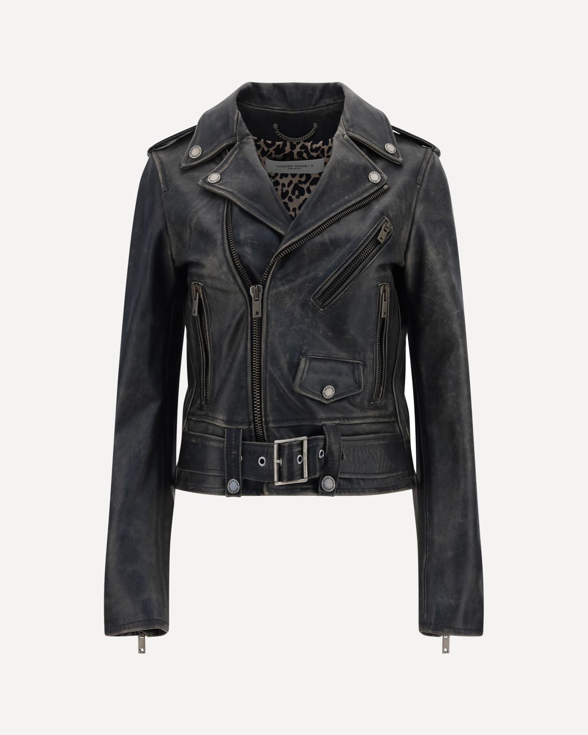Calfskin Jacket by Golden Goose, asymmetrical front zipper closure, classic lapels with metallic buttons, slanted welt pocket on front, two side welt pockets, waistband with metallic buckle, patch pocket on front with snap button for closure, zipper on cuffs, tone-on-tone stitching. DETAILS sku GWP00848P000647_90100 composition : CALF LEATHER BOS TAURUS 100% color group : BLACK gender : WOMAN season : AW23 size chart : WOMAN IT category name : LEATHER JACKETS