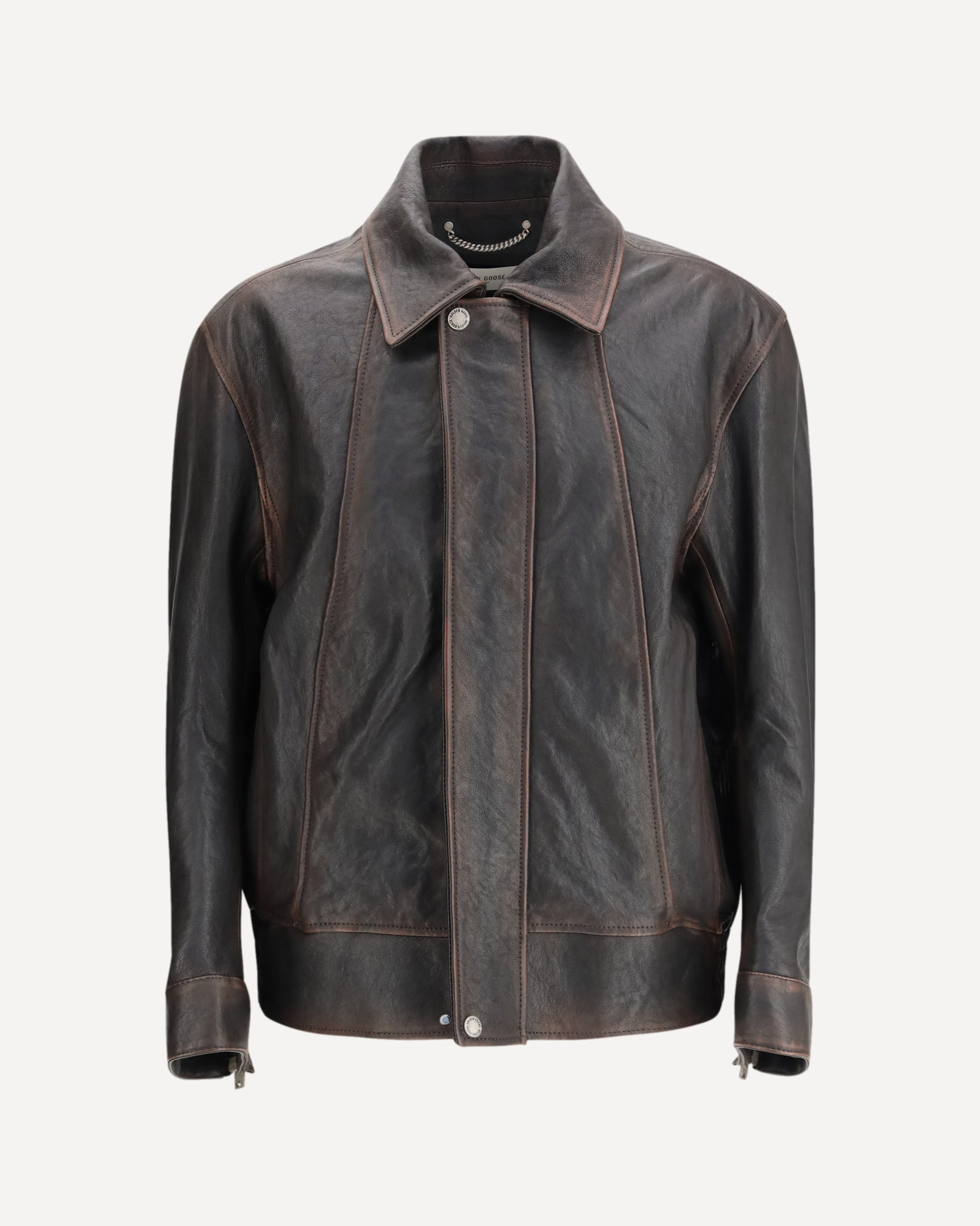 The Bomber Jacket by Golden Goose is crafted from soft burgundy nappa leather and features a regular fit that blends contemporary style with a touch of Seventies-inspired funky glamour. The design includes a pointed collar, a front closure with a concealed zipper and two logoed buttons, sleeve hems with zip details, and an elasticated waistband. Ton-sur-ton piping adds refined structure, while the signature double star applied on the back highlights the brand’s identity. The handmade lived-in artisanal treatment gives the jacket a unique, authentic character, ideal for those seeking individuality and style. DETAILS - Sku: GMP02531P002301_40249 - Season: SS26 - Fit: Regular - Composition: OUTER 100% Goatskin/hircus Goatskin INNER 100% Viscose - MADE IN ITALY