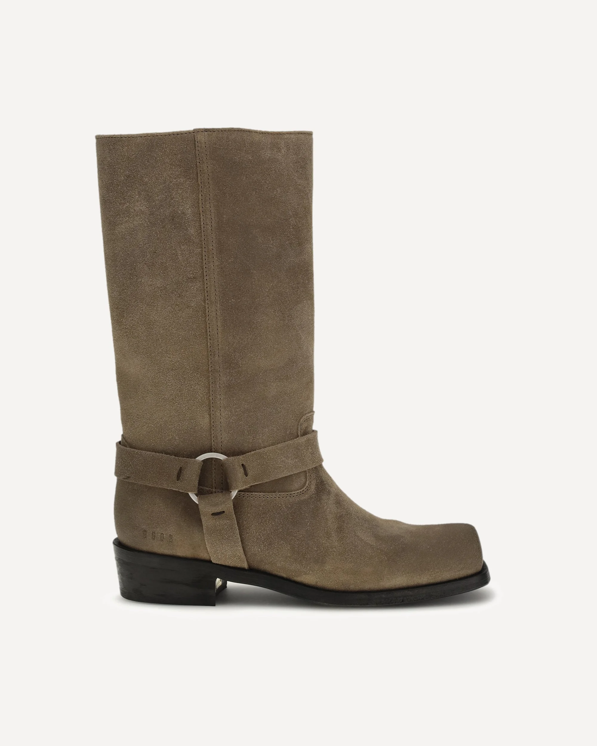 Women's high Biker boots in dark beige waxed suede with strap and a silver-colored buckle