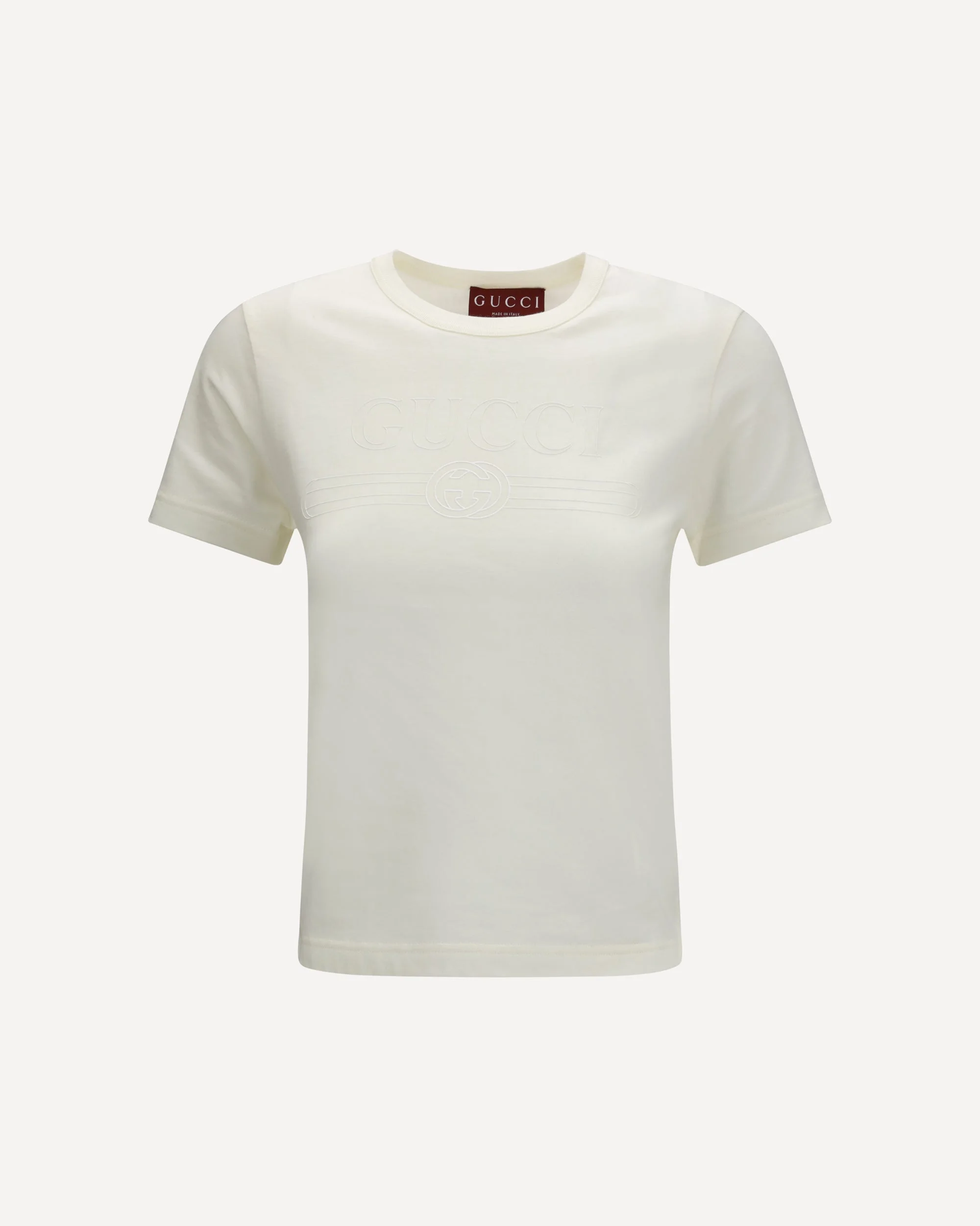 The cotton T-shirt by Gucci reinterprets an essential wardrobe piece with the house’s iconic aesthetic. Crafted from pure cotton, it stands out for the rubberized Gucci Interlocking GG print on the chest, a distinctive detail referencing one of the brand’s most recognizable motifs. The design features a ribbed crewneck, side slits at the hem, and a slightly longer back, creating a modern and comfortable fit. DETAILS - Sku: 805285XJHQ1_9750 - Season: SS26 - Fit: Regular - Composition: GENERAL 100% Cotton - MADE IN ITALY