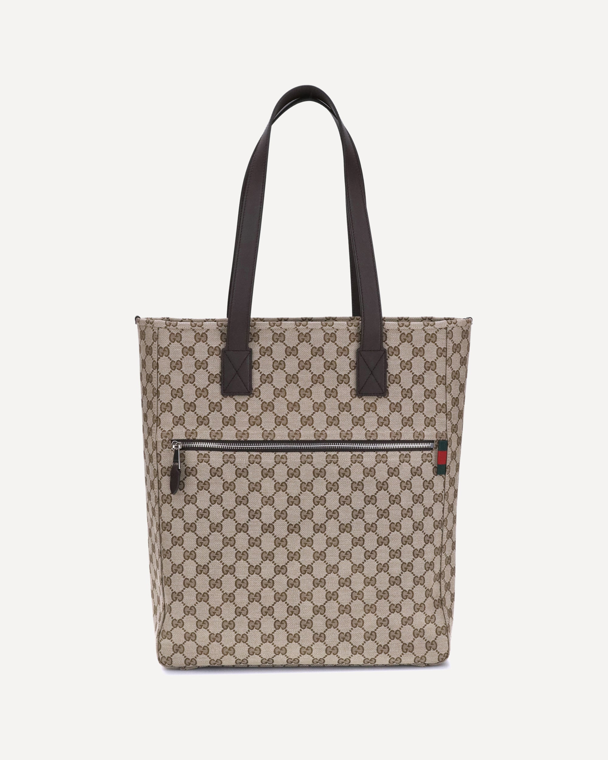 Gucci's GG canvas Tote Bag is a timeless classic that combines practicality and iconic luxury. Made of the celebrated GG canvas, it is enhanced by elegant dark brown leather trim that outlines its structure. The distinctive green and red Web detail adds an instantly recognizable splash of color, a symbol of Gucci's heritage. Interior organization is optimized with a zippered pocket and two open pockets, while the exterior features a zippered pocket for quick access to essentials. The secure zipper closure completes the design, making it the perfect bag to combine style and functionality in everyday life. DETAILS - Sku: 834456FAEPS_9752 - Season: AW25 - Dimension: 35x35x12 - Composition: GENERAL 100% Fabric - MADE IN ITALY