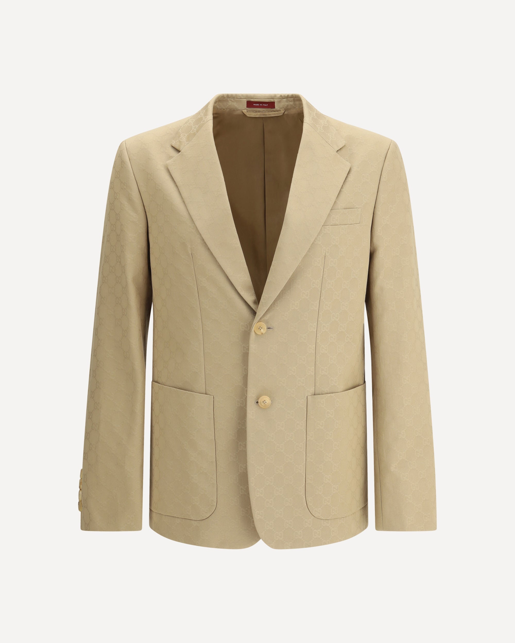 Gucci's GG jacquard blazer is an elegant and distinctive piece made of jacquard fabric with the iconic GG pattern. Fully lined, it features a single-breasted button closure, notch lapels, a chest pocket and two front pockets. A perfect balance of sartorial tradition and contemporary style. DETAILS - Sku: 827953Z7AP6_2159 - Season: AW25 - Fit: Regular - Composition: GENERAL 100% Cotton - MADE IN ITALY