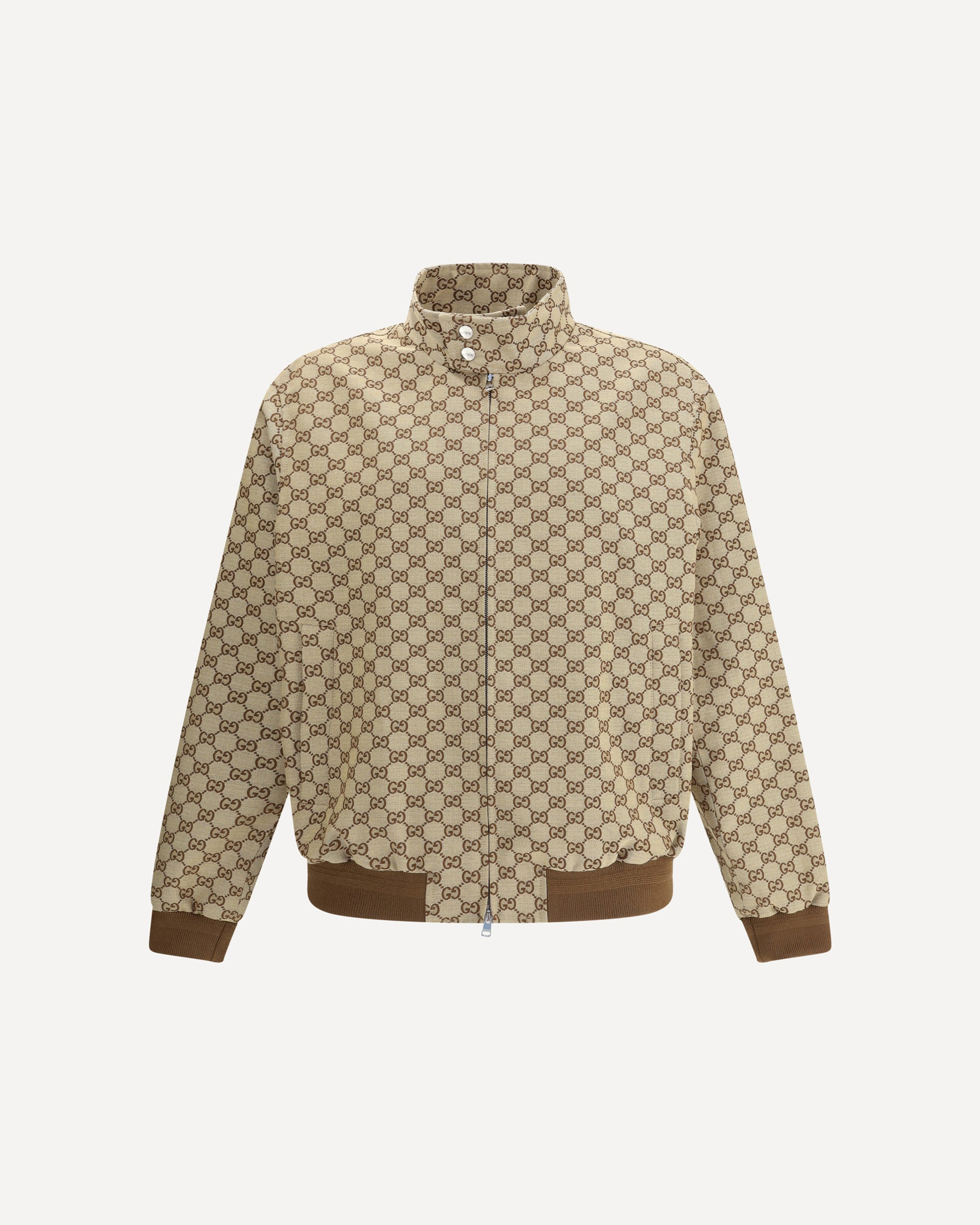Gucci's GG Supreme Jacket features a sporty, iconic design with a high collar fastened with snap buttons and a front zipper closure. Two side welt pockets, ribbed hem and cuffs complete the design for a comfortable fit and distinctive style. DETAILS - Sku: 826575ZAF4S_2580 - Season: AW25 - Fit: Regular - Composition: GENERAL 70% Cotton 30% Polyester - MADE IN ITALY