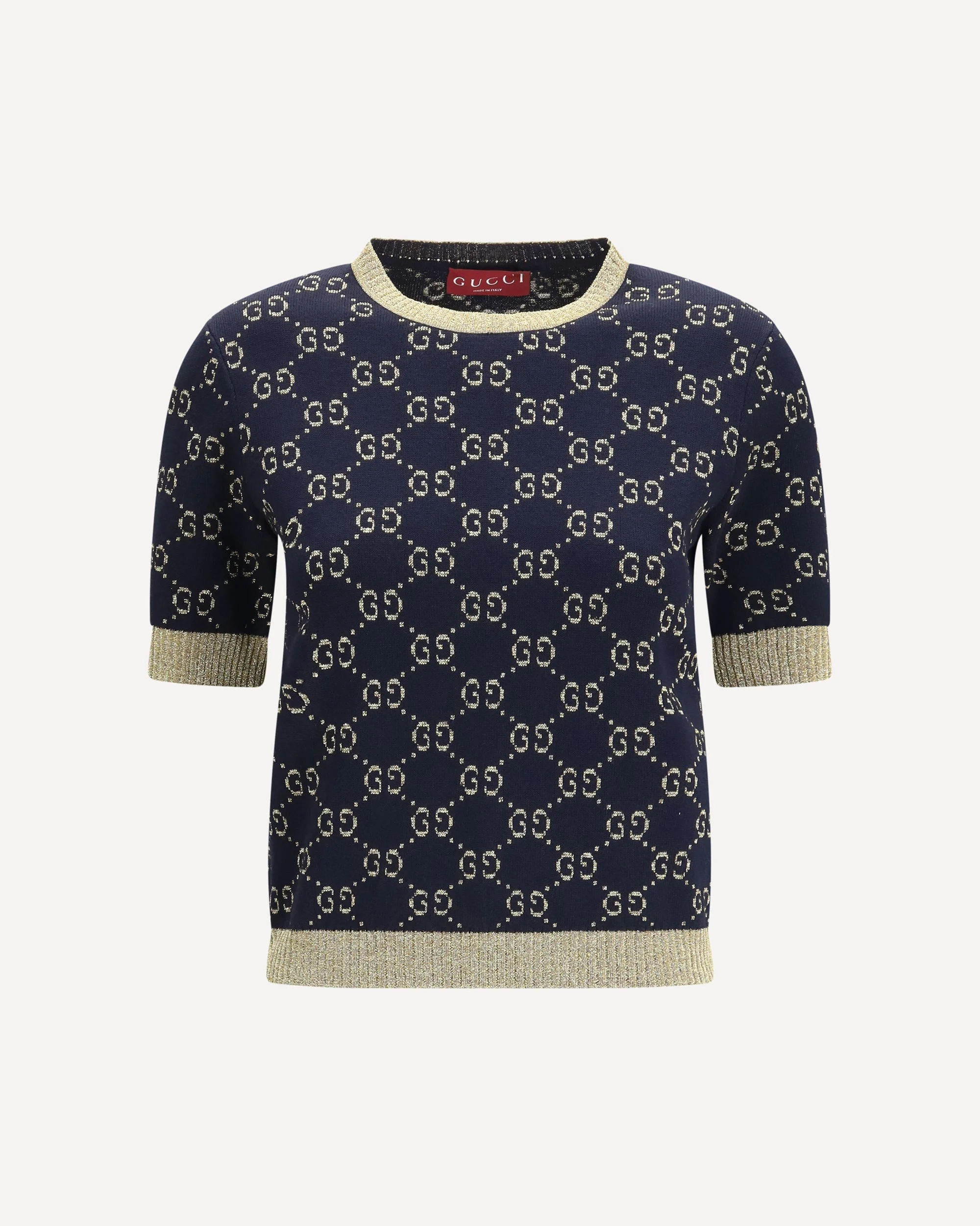 The knit Top with its iconic all-over monogram pattern by Gucci, adding a distinctive and elegant touch throughout. The design features short sleeves, an elasticated hem for a comfortable fit, and a refined gold-tone neckline detail that enhances its sophisticated appeal. An internal logo completes the piece, highlighting the maison’s authenticity and craftsmanship. DETAILS - Sku: 526759X9W83_4921 - Season: SS26 - Fit: Slim - Composition: GENERAL 77% Cotton 11% Polyester 12% Polyamide - MADE IN ITALY