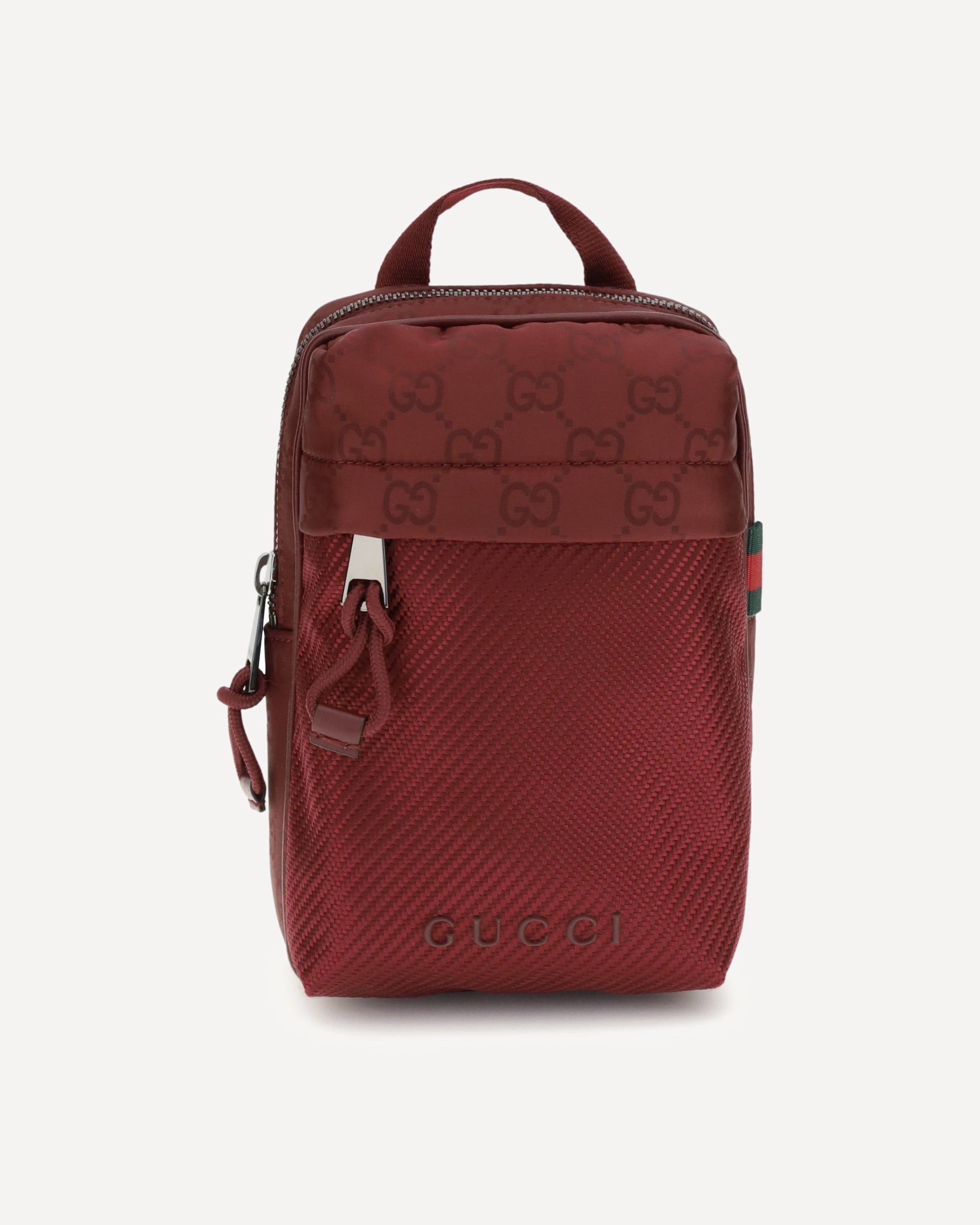 Gucci's Nexus Mini Shoulder Bag is made of Gucci Rosso Ancora GG nylon, featuring the iconic green and red web that underscores its distinctive style. It features a tone-on-tone Gucci logo and a coordinating Gucci Rosso Ancora nylon lining. The mesh detail adds a unique touch to the design. The interior features a pocket, while the exterior features a zippered pocket for added convenience. The adjustable fabric shoulder strap and zippered closure complete the design, combining functionality and sophistication. DETAILS - Sku: 834274FAEOS_6261 - Season: AW25 - Dimension: 12.5x12.5x4 - Composition: GENERAL 100% Nylon - MADE IN ITALY