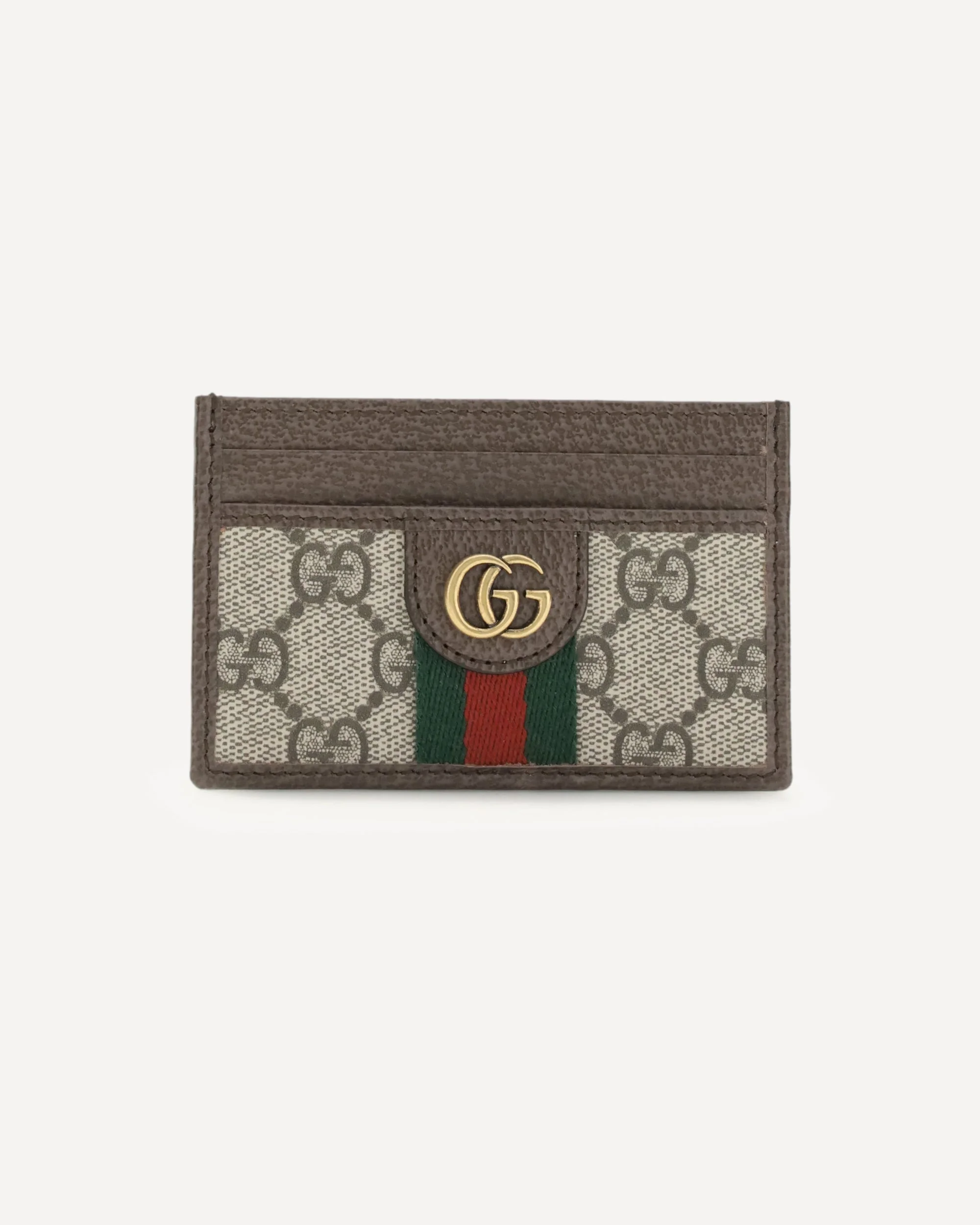 The Ophidia Card holder by Gucci revisits the House’s iconic aesthetic, crafted from beige and dark brown GG coated canvas and enriched with the signature Web stripe and the gold-tone Double G emblem. Compact yet functional, it features four external card slots and an open central compartment, finished with dark brown leather trims and moire lining. A refined essential that embodies the timeless elegance of the Ophidia line. DETAILS - Sku: 834795FAEOI_9746 - Season: SS26 - Dimension: 11x11 - Composition: GENERAL 100% Fabric - MADE IN ITALY