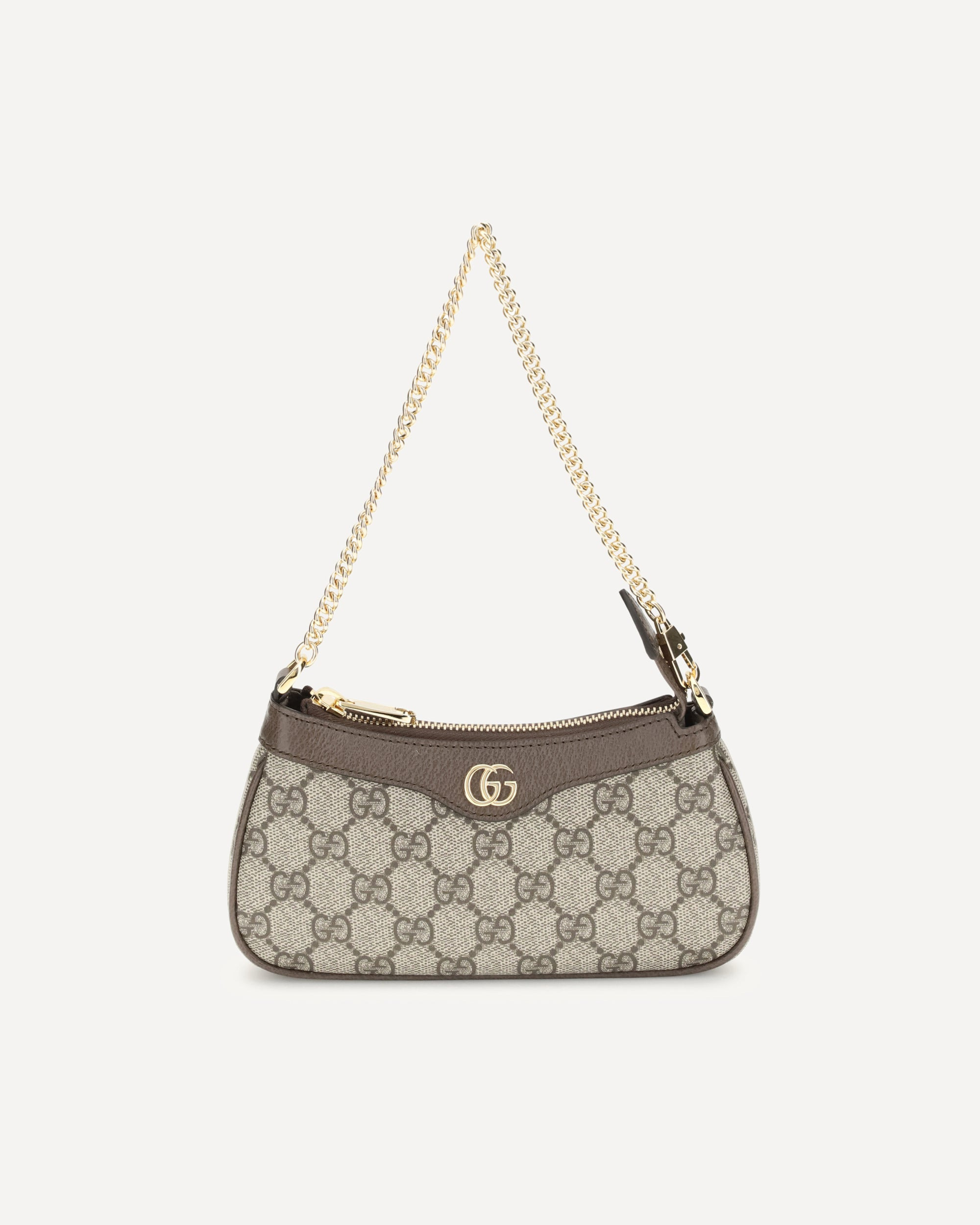 Gucci's Ophidia mini Handbag combines elegance and contemporary style. Made of beige and ebony GG Supreme fabric with brown leather trim and gold detailing, it features the iconic double G on the front. Internally, the cotton and linen lining houses an open pocket. A chain handle and top zipper closure complete the design, ensuring practicality and sophistication. DETAILS - Sku: 764960K9GSG_8367 - Season: AW25 - Dimension: 19x19x3 - Composition: GENERAL 80% Cotton 20% Calf Leather Bos Taurus - MADE IN ITALY