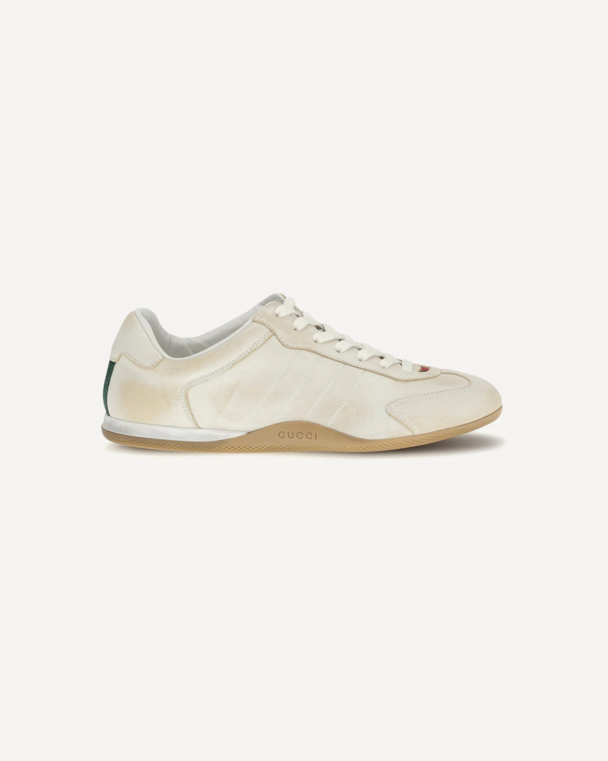 The Shift Sneakers by Gucci, made of black delave-effect leather, feature leather lining for comfort and breathability. The low-top style is enhanced by the red and green Web tab and back detail, while the two-tone rubber sole with Gucci logo and lace-up closure complete the design with style and functionality. DETAILS - Sku: 857016AAF0E_9073 - Season: SS26 - Composition: UPPER 100% Calf Leather Bos Taurus SOLE 100% Rubber - MADE IN ITALY
