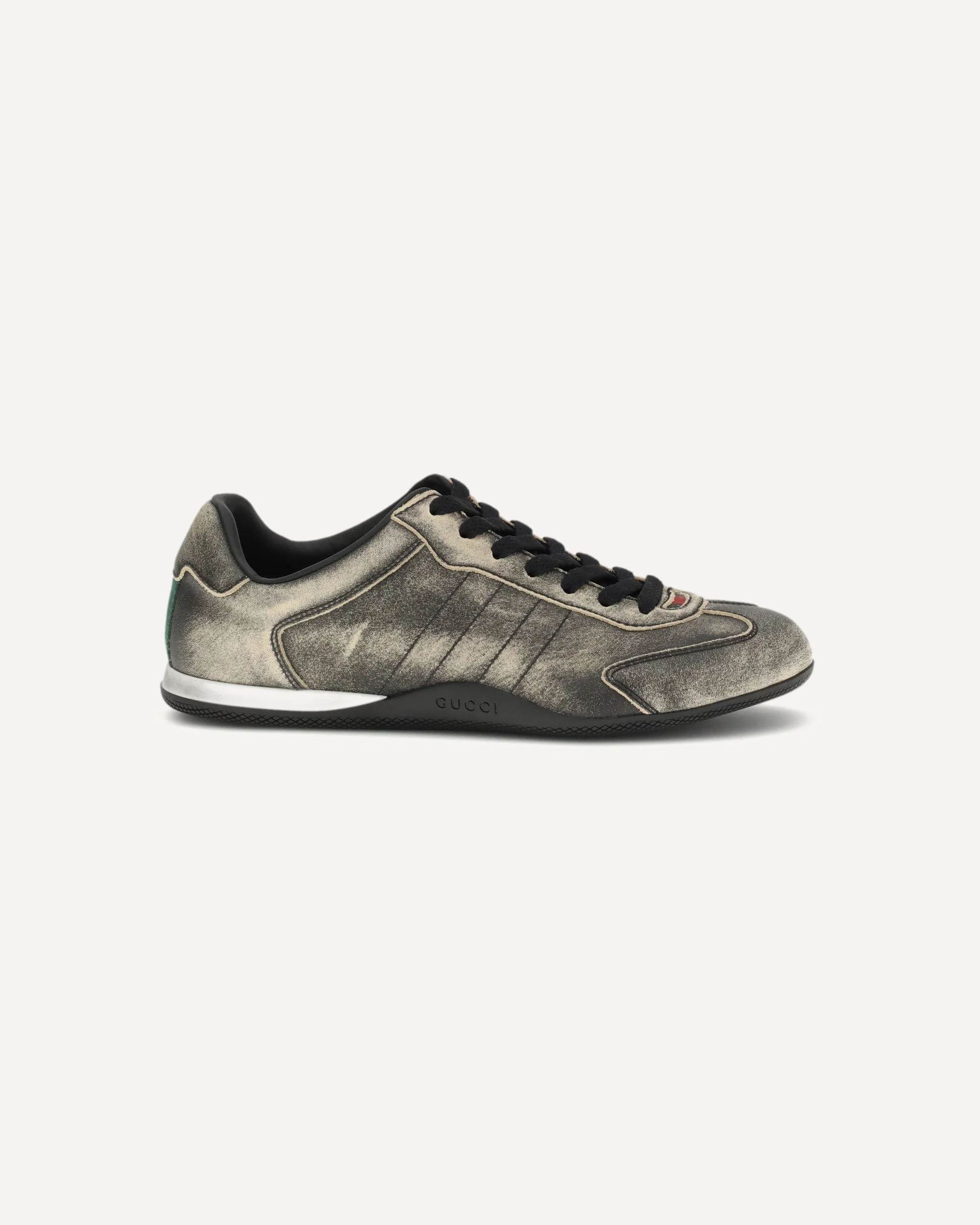 The Shift Sneakers by Gucci, made of black delave-effect leather, feature leather lining for comfort and breathability. The low-top style is enhanced by the red and green Web tab and back detail, while the two-tone rubber sole with Gucci logo and lace-up closure complete the design with style and functionality. DETAILS - Sku: 857016AAF0E_1086 - Season: SS26 - Composition: UPPER 100% Calf Leather Bos Taurus SOLE 100% Rubber - MADE IN ITALY