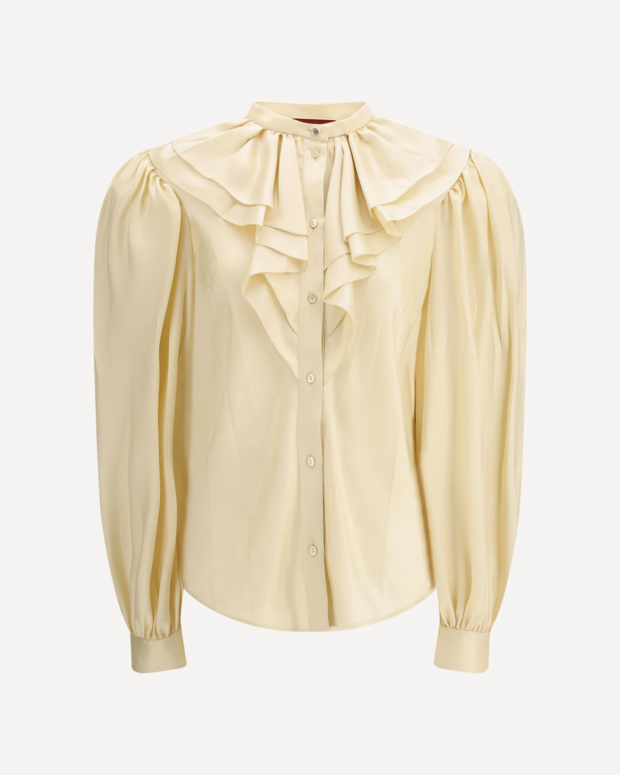 The silk twill Shirt by Gucci embodies refined elegance with a confident romantic flair. Designed in a regular fit, it fits true to size and offers effortless wearability, while the silk twill fabric provides a smooth, fluid feel with a subtle sheen. The silhouette is enhanced by delicate ruffle trim, contrasted with wide shoulders that add structure and modern attitude. Long sleeves and a single-row front button closure, finished with the iconic Interlock G button detail, complete a sophisticated piece that transitions seamlessly from polished daywear to elevated evening looks. DETAILS - Sku: 854515ZAJQ7_2304 - Season: SS26 - Fit: Regular - Composition: GENERAL 100% Silk - MADE IN ITALY