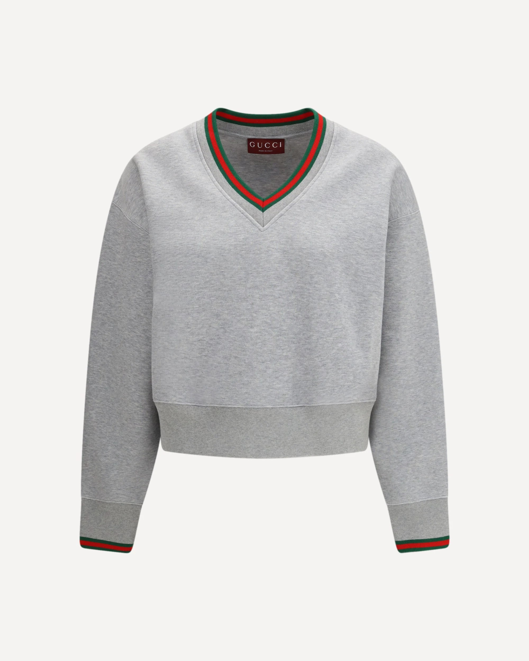The Web cotton jersey Sweatshirt by Gucci is a casual-chic piece crafted from soft light gray cotton jersey. The Web motif, an iconic symbol of the fashion house, adorns the trim, adding a distinctive and recognizable touch. The V-neck and long sleeves complete the design, offering a comfortable and modern fit. Perfect for those looking for a casual style with a touch of luxury, this sweatshirt is ideal for a sporty yet elegant look. DETAILS - Sku: 847933XJHIR_1160 - Season: SS26 - Fit: Regular - Composition: GENERAL 100% Cotton - MADE IN ITALY