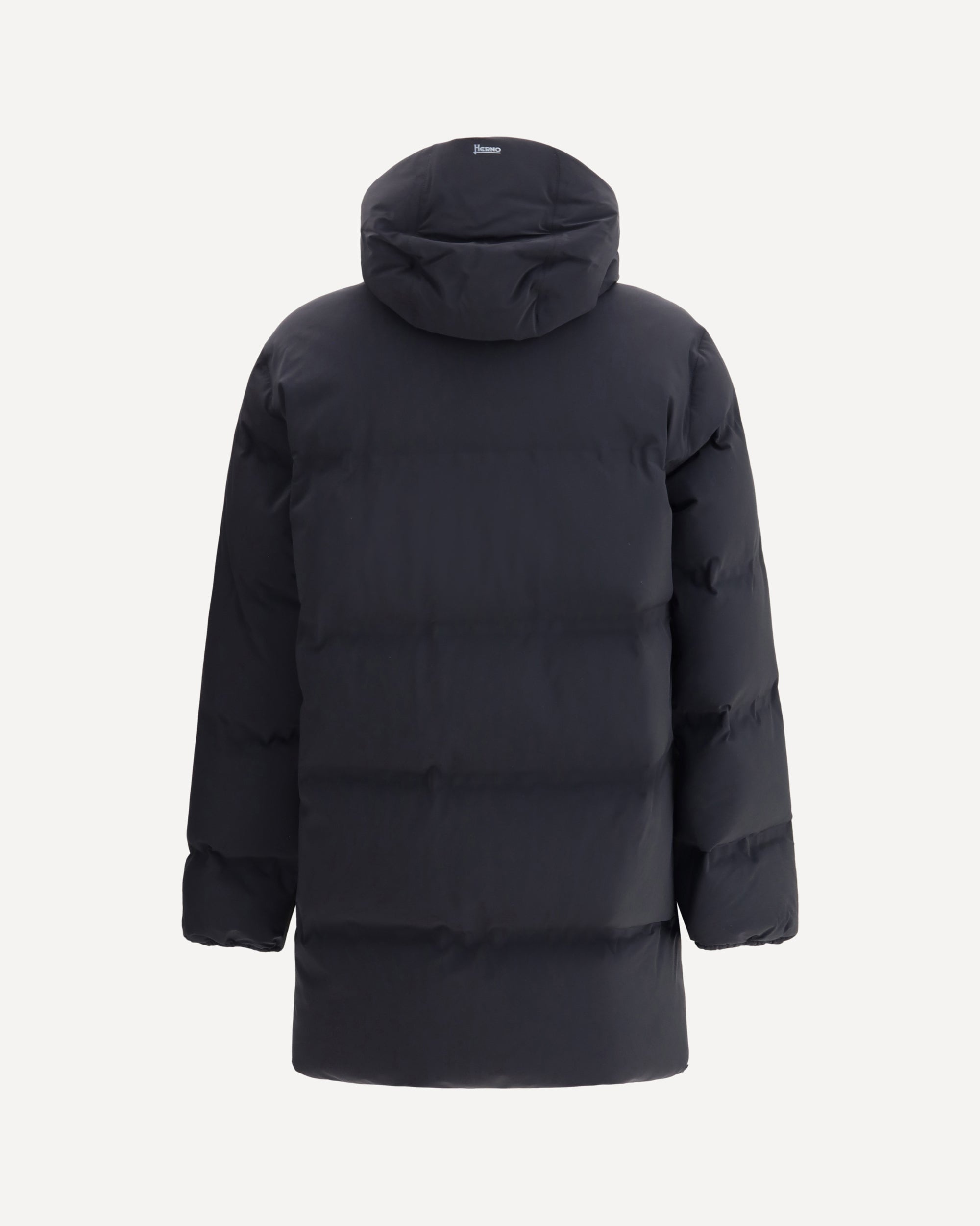 Herno's Down Jacket features a high collar and hooded design for complete protection from the cold. The front closure features a double-slider zipper, while two welt pockets with side zippers provide convenience. Elasticized cuffs ensure comfort, and an adjustable hem with internal drawstring allows for a customized fit. The all-over quilted and padded design ensures warmth and style in every detail. DETAILS - Sku: PI001246U12590SZ_9300 - Season: AW25 - Fit: Regular - Composition: OUTER 100% Polyester INNER 100% Goose Down - MADE IN MOLDOVA
