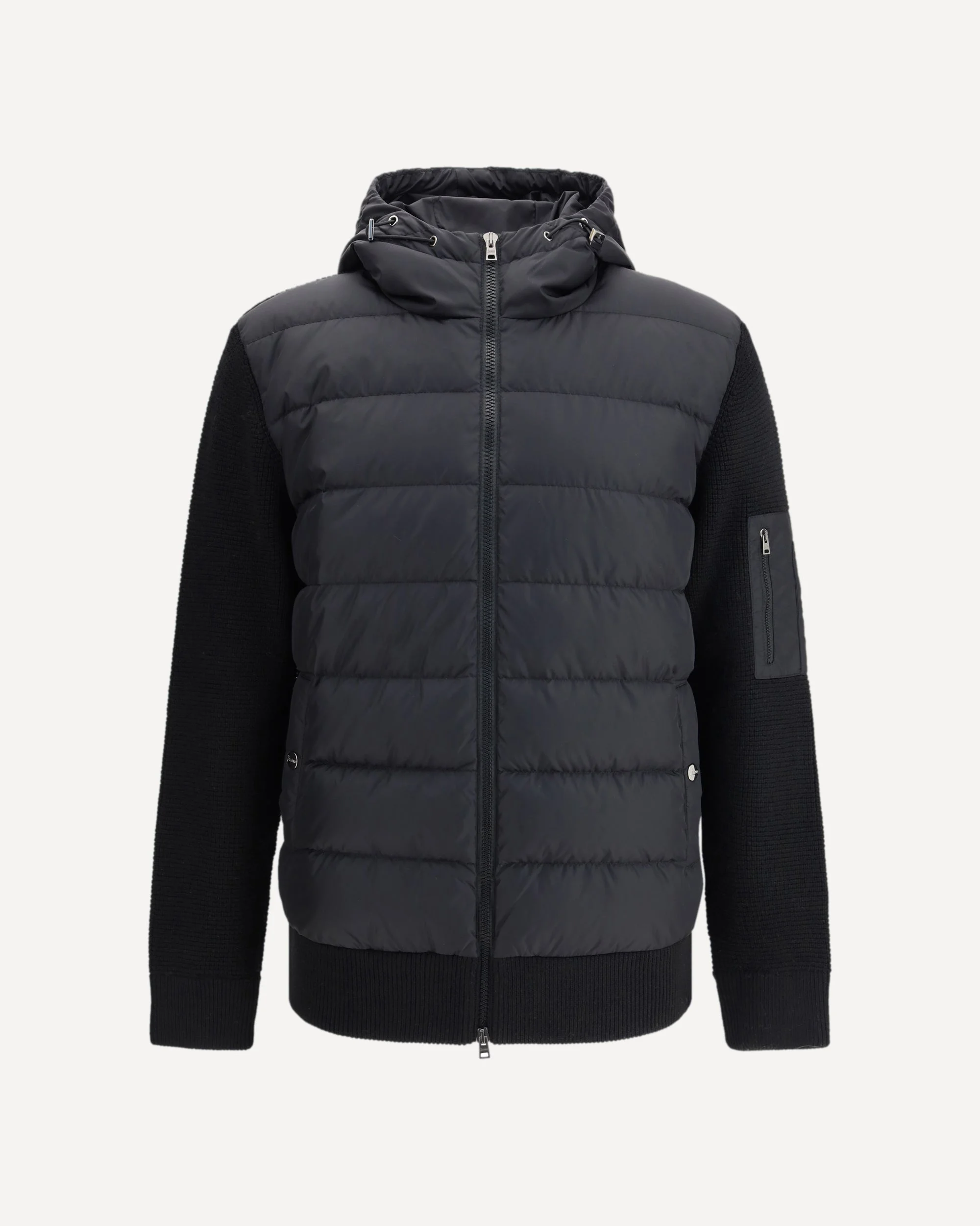 The Quilted Bomber Jacket with Wool Sleeves by Herno blends practicality with modern elegance. The bi-material construction in nylon and wool balances technical performance with softness, while the down filling ensures warmth and lightness. Featuring a drawstring hood, functional pockets, and refined detailing, this versatile piece accompanies every moment with effortless style. DETAILS - Sku: MP000135U70259_9300 - Season: AW25 - Fit: Regular - Composition: OUTER 50% Wool 50% Polyamide INNER 63% Viscose 37% Polyester - MADE IN TURKEY