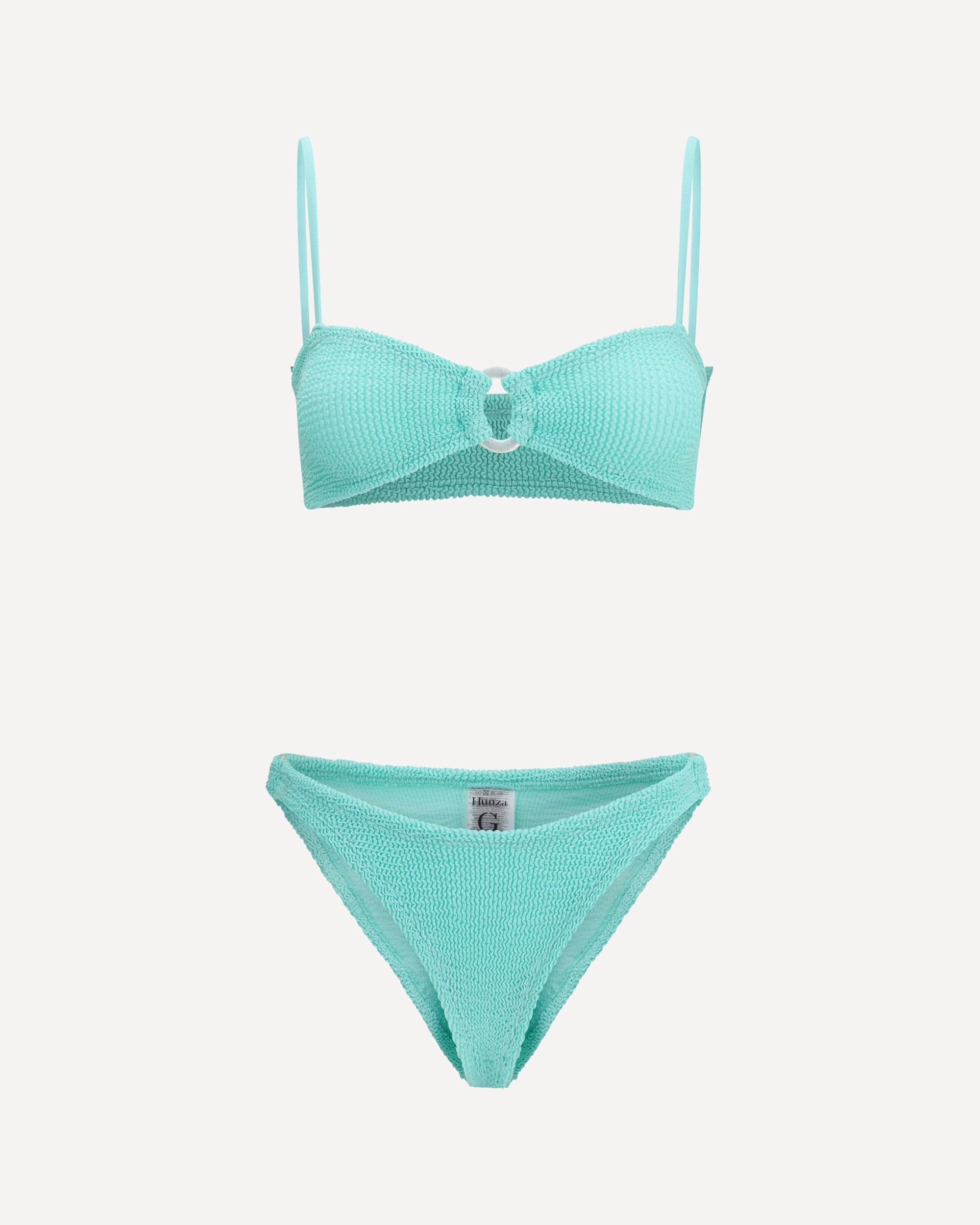 The Misty Swimsuit by Hunza G is ideal for those seeking a sophisticated and modern look. The bikini model is composed of low-waisted bottoms and a top with thin straps, enriched by a cut-out detail with a ring on the front, which adds a touch of distinctive style. The exclusive Original Crinkle workmanship allows the fabric to stretch to flex, sculpt and support every curve, adapting perfectly to all body types, ensuring a unique fit. DETAILS - Sku: BMISTYPRL_METALLICMI - Season: AW25 - Fit: Slim - Composition: GENERAL 100% Polyamide - MADE IN MOROCCO