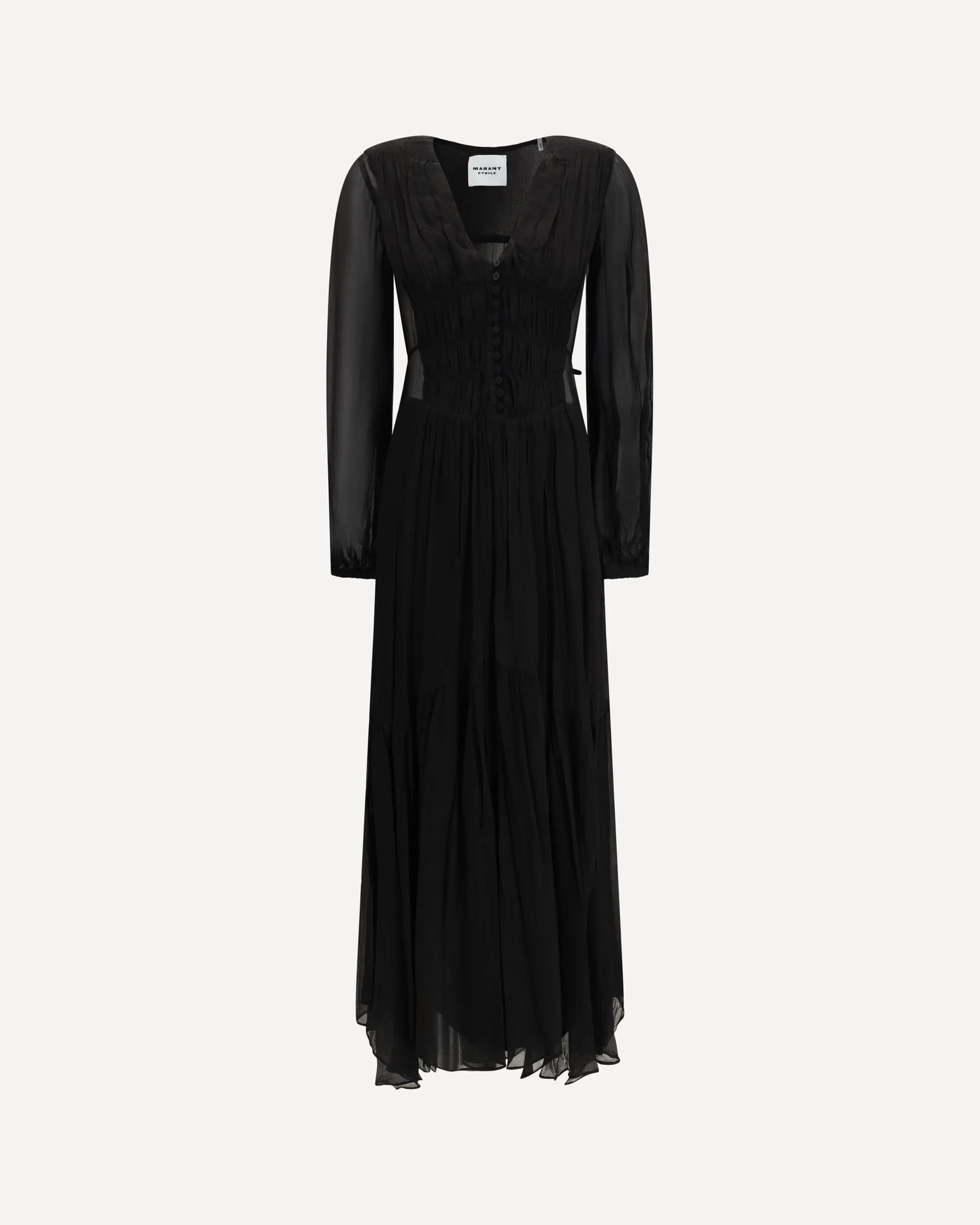 The buttoned sheer maxi Dress by Marant Etoile reflects the brand’s signature refined bohemian aesthetic. The design features sheer details that create lightness and movement throughout the silhouette, enhanced by a V-neckline and long sleeves. The front button fastening follows the fluid construction of the piece, while the tiered skirt adds volume and dynamic flow. A feminine and effortless dress, ideal for a contemporary look with a romantic attitude. DETAILS - Sku: RO0798FBD1J08E_01BK - Season: SS26 - Fit: Regular - Composition: GENERAL 100% Viscose - MADE IN INDIA