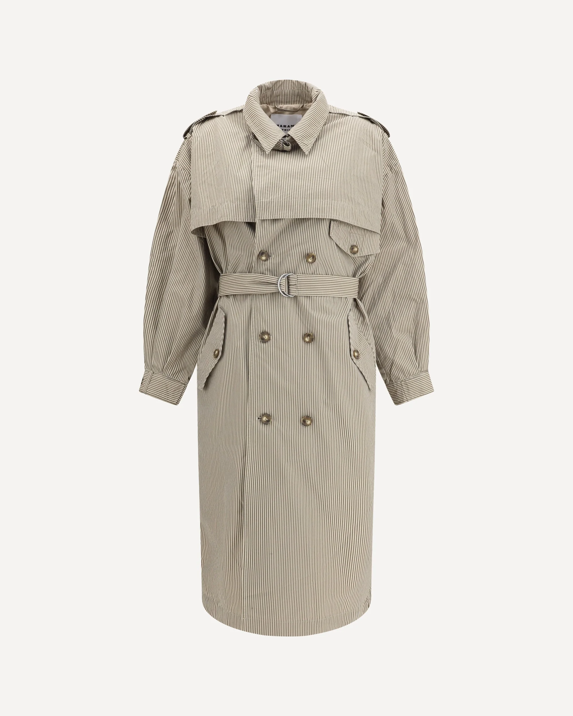 The Chilma striped Coat by Marant Etoile combines relaxed elegance with a contemporary attitude. The design features a striped pattern that enhances the silhouette with a refined graphic touch. It has a front button closure and a waist belt that allows the fit to be adjusted while defining the shape. Long sleeves and flap pockets complete the design with both functionality and style, making it a versatile piece for sophisticated yet effortless looks. DETAILS - Sku: MA0488FAD1C02E_BEKH - Season: SS26 - Fit: Regular - Composition: GENERAL 100% Cotton - MADE IN CHINA