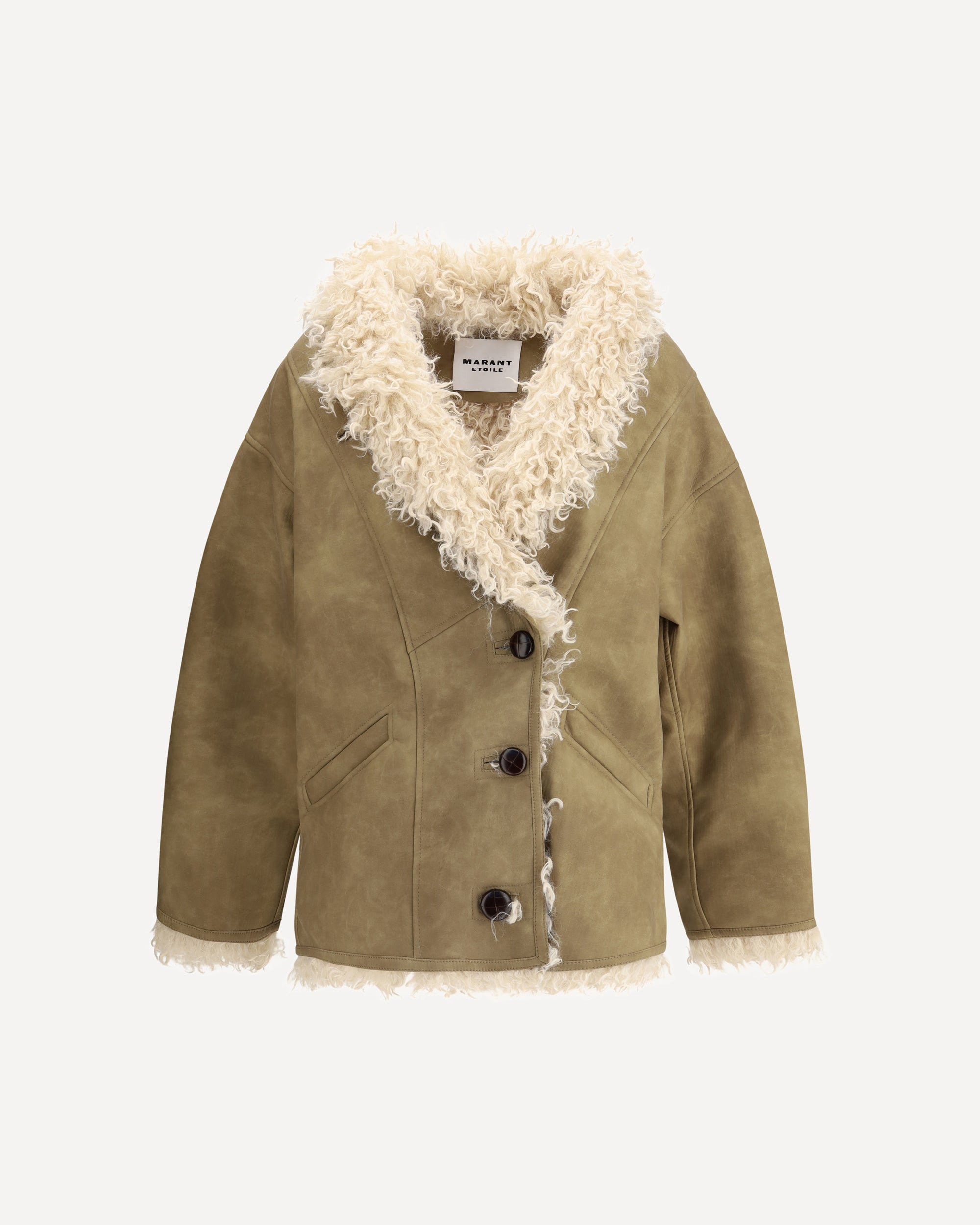 Marant Etoile's Clea Shearling-effect faux fur Coat combines warmth and style in a sophisticated design. Featuring a shawl collar, front button closure, long sleeves and raglan side pockets, it has a versatile and feminine midi cut, ideal for completing winter looks with elegance. DETAILS - Sku: MA0427FAC3A01E_50TA - Season: AW25 - Fit: Regular - Composition: GENERAL 100% Polyester - MADE IN INDIA