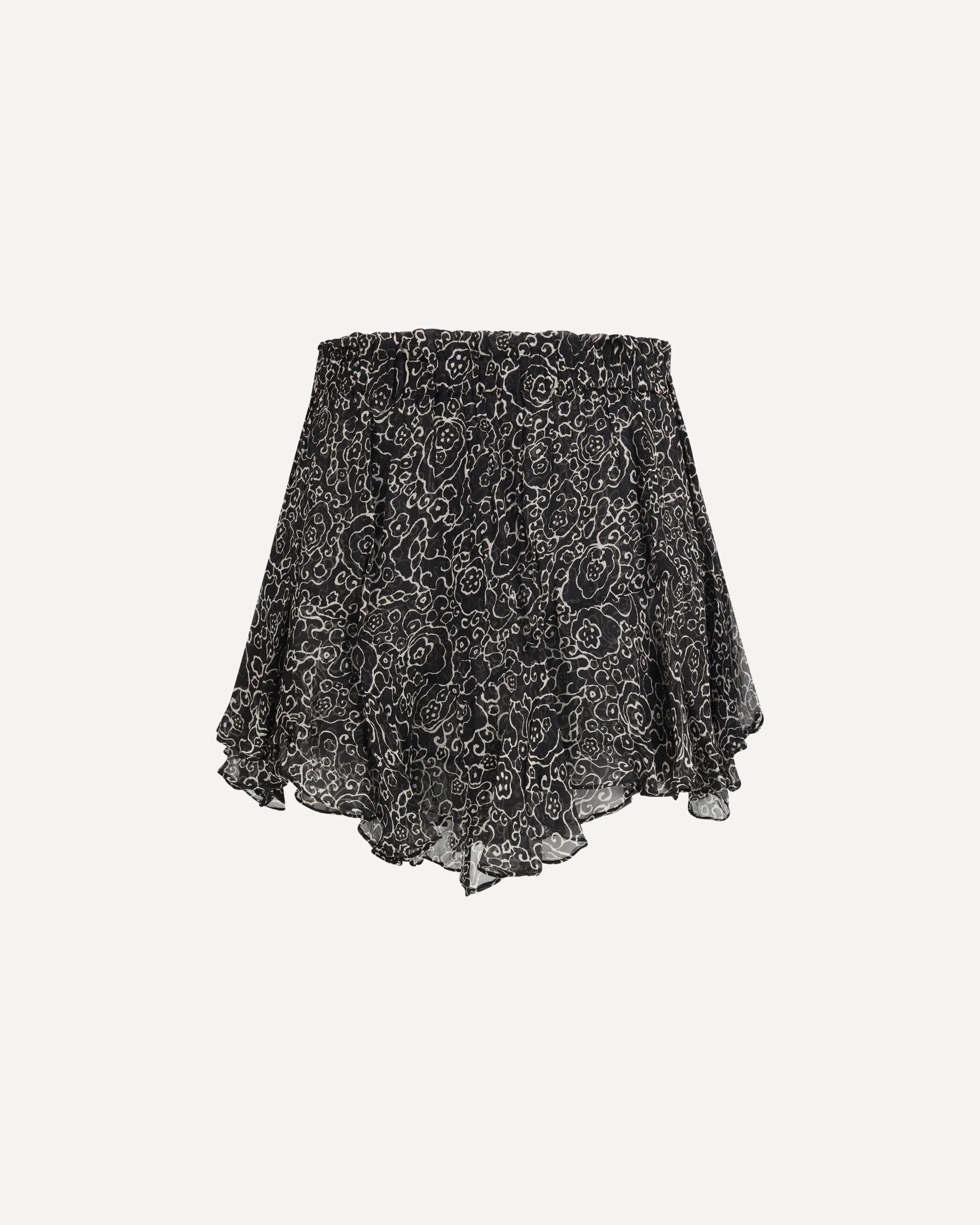 The Floral Ruffled Shorts in viscose by Marant Etoile express a light and feminine attitude through a relaxed and dynamic silhouette. Crafted from floral printed viscose, they feature a ruffled hem that adds movement and softness to the design. The elasticated waistband ensures comfort and an easy fit, completing a summer piece with the romantic and distinctive style of Marant Etoile. DETAILS - Sku: SH0018FAD1J08E_BKEC - Season: SS26 - Fit: Regular - Composition: GENERAL 100% Viscose - MADE IN INDIA