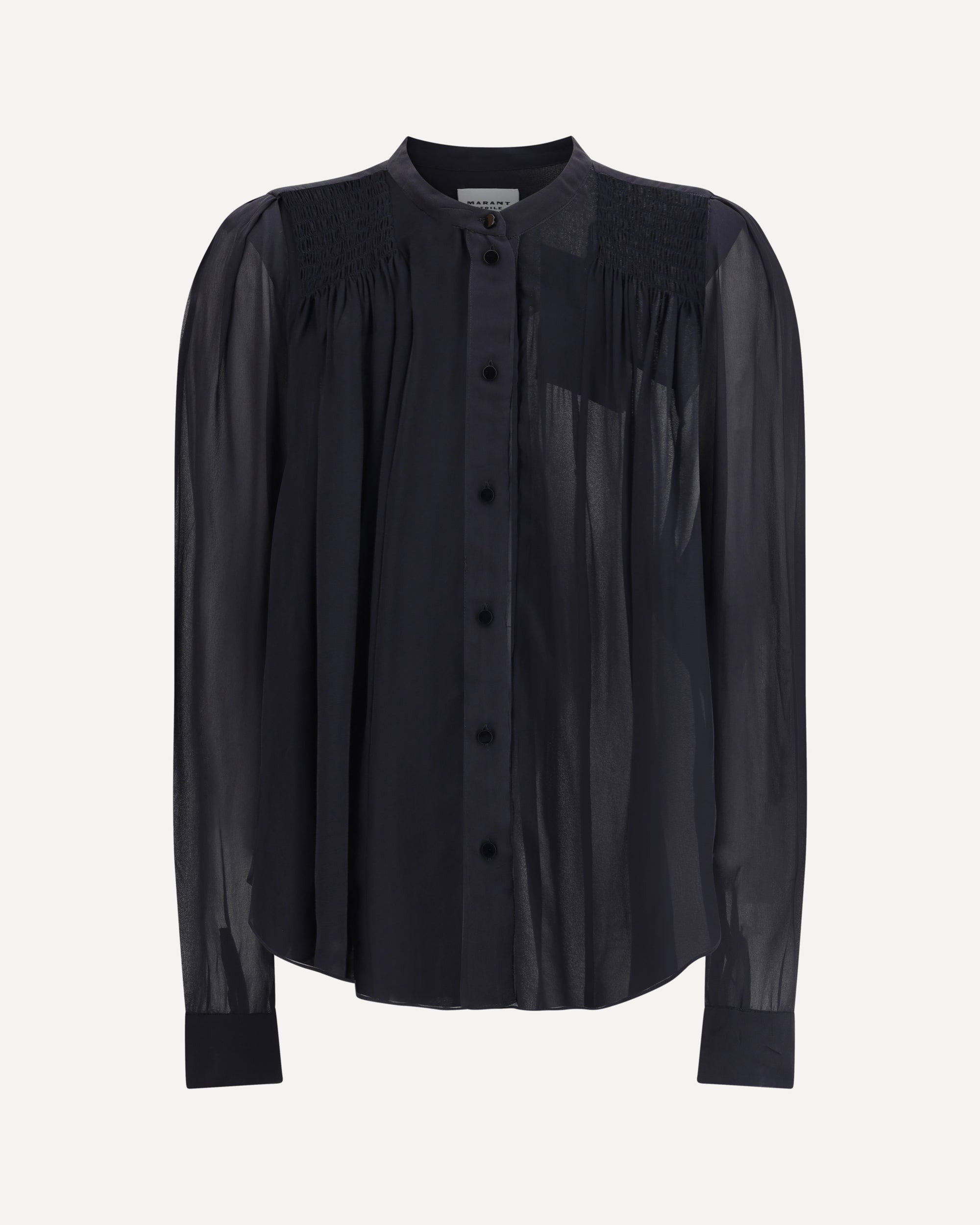 Noeline shirt by Marant Etoile with a romantic and contemporary appeal. The model features a front button closure, adjustable button cuffs and a slightly semi-transparent design that lends lightness and femininity to the garment. The shoulders are embellished with elasticated ruffles that add a delicate and distinctive touch. Perfect to pair with tailoring pants or denim for a refined and versatile look. DETAILS - Sku: HT0189FAC3J01E_01BK - Season: AW25 - Fit: Regular - Composition: GENERAL 100% Viscose - MADE IN INDIA