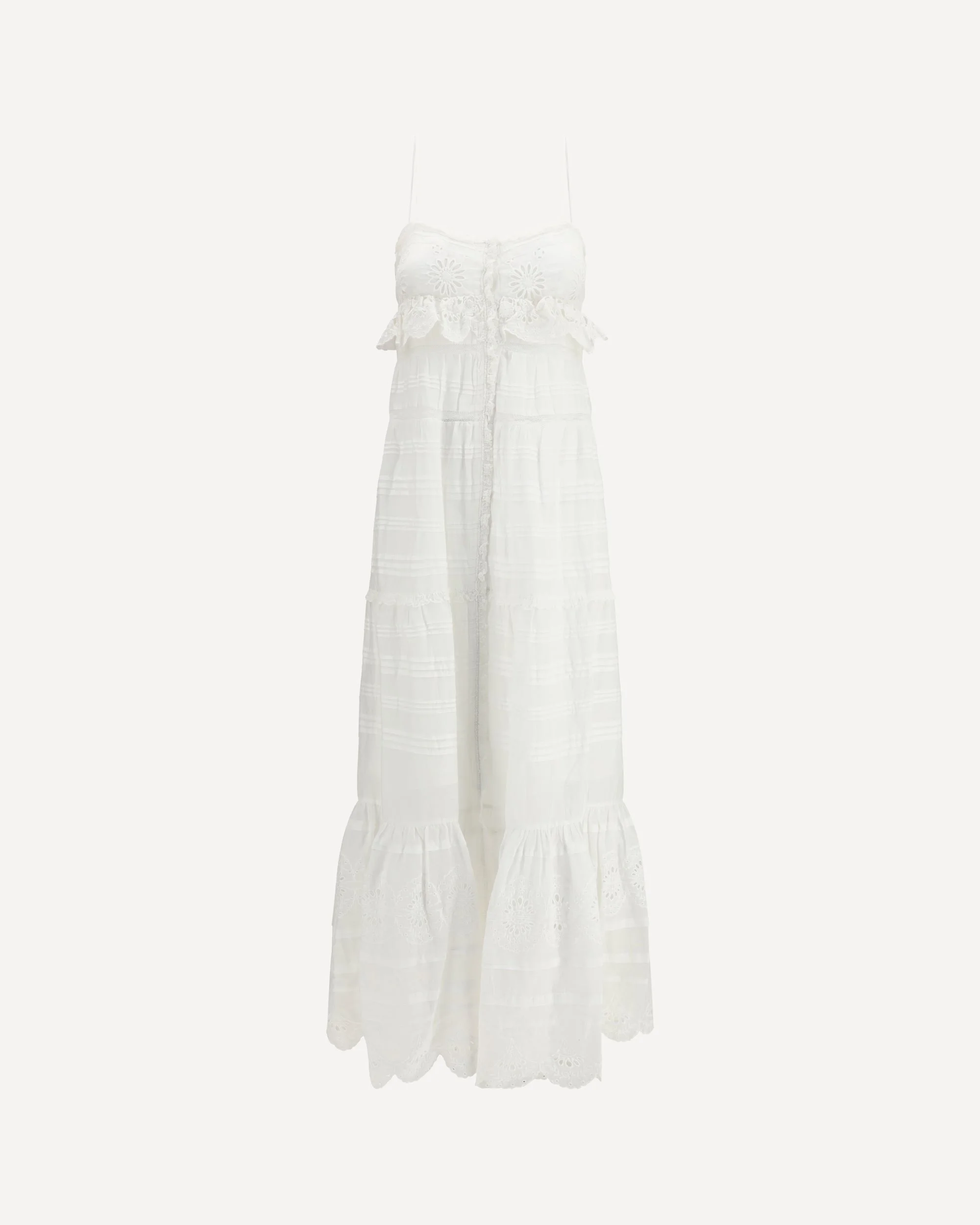 The Paule long ruffled Dress by Marant Etoile reflects the brand’s feminine and effortlessly romantic aesthetic. The design is defined by mesh details and delicate ruffle trims that add movement and lightness to the silhouette. The button fastening introduces a classic touch, while the tiered construction enhances the fluid shape of the dress, making it ideal for elegant yet relaxed styling. DETAILS - Sku: RO0951FAD1J05E_20WH - Season: SS26 - Fit: Regular - Composition: GENERAL 100% Cotton - MADE IN INDIA