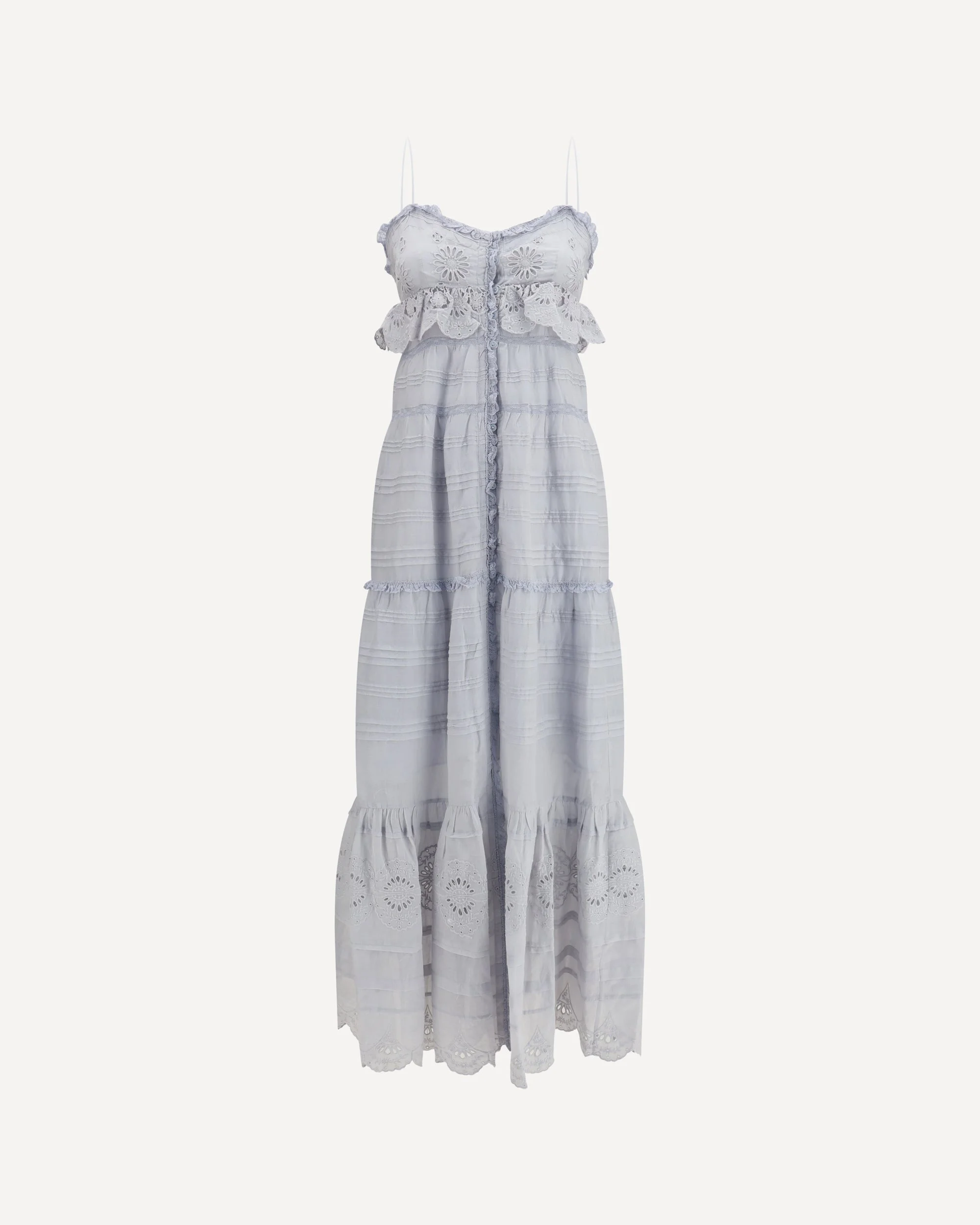 The Paule long ruffled Dress by Marant Etoile reflects the brand’s feminine and effortlessly romantic aesthetic. The design is defined by mesh details and delicate ruffle trims that add movement and lightness to the silhouette. The button fastening introduces a classic touch, while the tiered construction enhances the fluid shape of the dress, making it ideal for elegant yet relaxed styling. DETAILS - Sku: RO0951FAD1J05E_30LU - Season: SS26 - Fit: Regular - Composition: GENERAL 100% Cotton - MADE IN INDIA