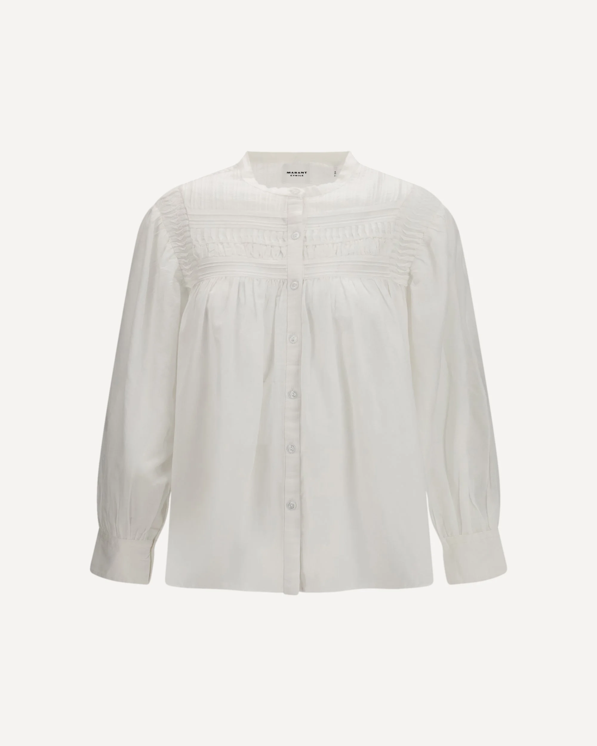 The Plalia cotton Shirt by Marant Etoile delivers an effortless sense of everyday elegance with a natural, relaxed attitude. Crafted from pure cotton, it features a crew neckline that creates a clean and feminine line. A front button closure structures the design with simplicity, while angular buttoned cuffs add a refined and distinctive detail. A piece designed to complement daily looks with ease and authenticity. DETAILS - Sku: HT0002FCB3J04E_20WH - Season: SS26 - Fit: Regular - Composition: GENERAL 100% Cotton - MADE IN INDIA