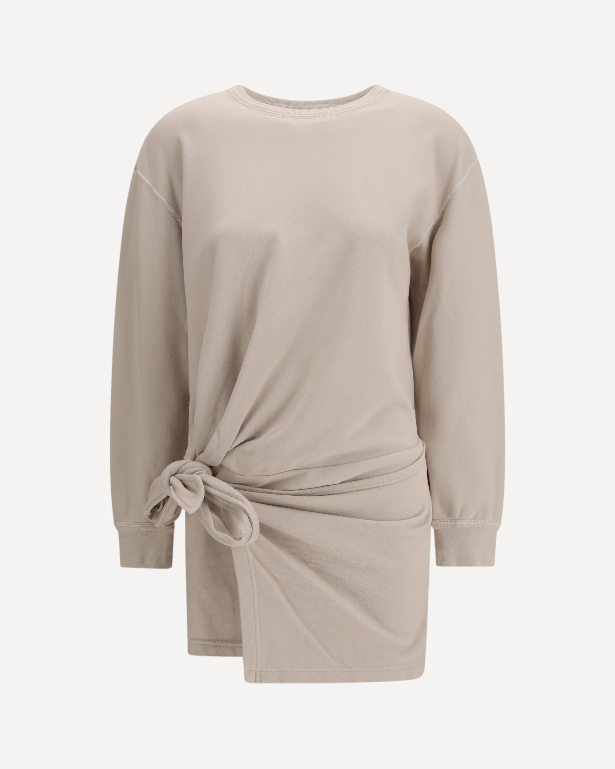 The Zae fleece Dress by Marant Etoile offers a casual yet contemporary aesthetic. Designed with a classic crew neck and long sleeves, it features an asymmetric hem that adds movement and a dynamic edge to the silhouette. The washed effect gives the dress a relaxed, lived-in feel, while the tie detail allows for adjustable styling. A comfortable and versatile piece, perfect for modern everyday looks. DETAILS - Sku: RO1014FAD1M01E_90BE - Season: SS26 - Fit: Regular - Composition: GENERAL 100% Cotton - MADE IN PORTUGAL