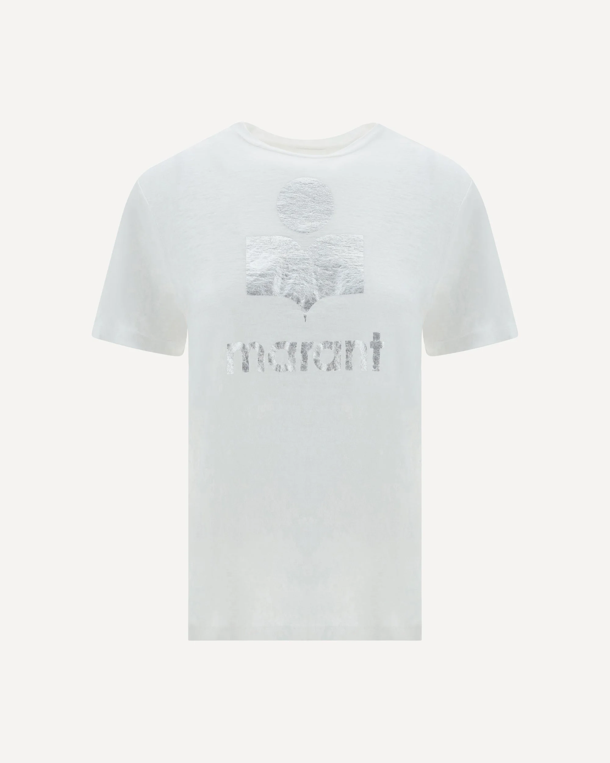 Linen Zewel T-Shirt by Marant Etoile, features ribbed crew neck, monochrome design, iconic brand monogram printed in contrast at front, regular fit. DETAILS - Sku: TS0001FBA1N10E_20WH - Season: SS25 - Composition: GENERAL 100% Linen - MADE IN TUNISIA