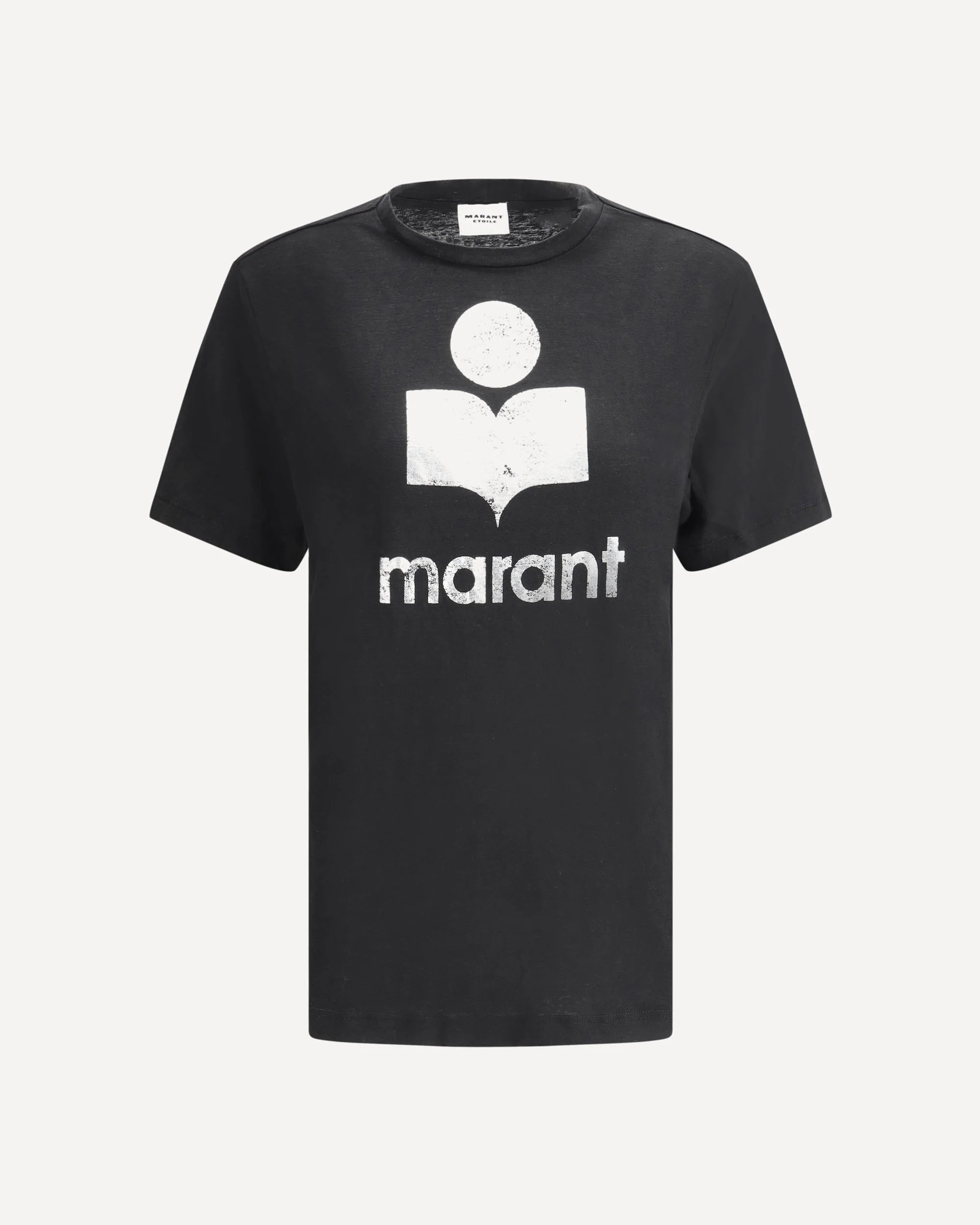 Linen Zewel T-Shirt by Marant Etoile, features ribbed crew neck, monochrome design, iconic brand monogram printed in contrast at front, regular fit. DETAILS - Sku: TS0001FBA1N10E_01BK - Season: SS25 - Composition: GENERAL 100% Linen - MADE IN TUNISIA